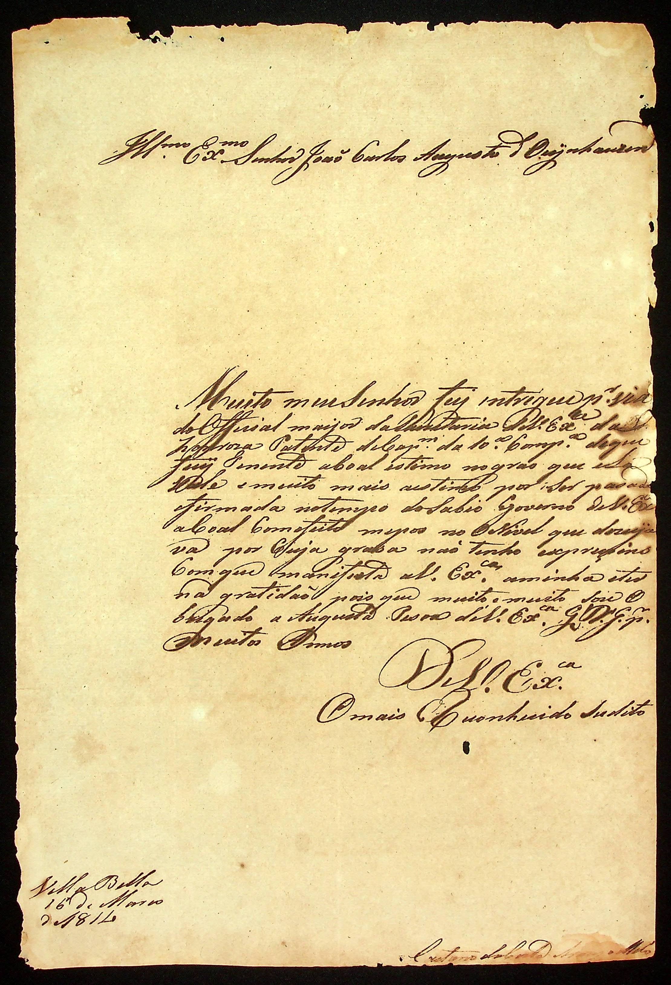 CARTA do Capitão da 10ª Companhia Caetano da Costa Araújo Melo ao [Governador e Capitão-General da Capitania de Mato Grosso] João Carlos Augusto d’Oeynhausen e Gravenberg.