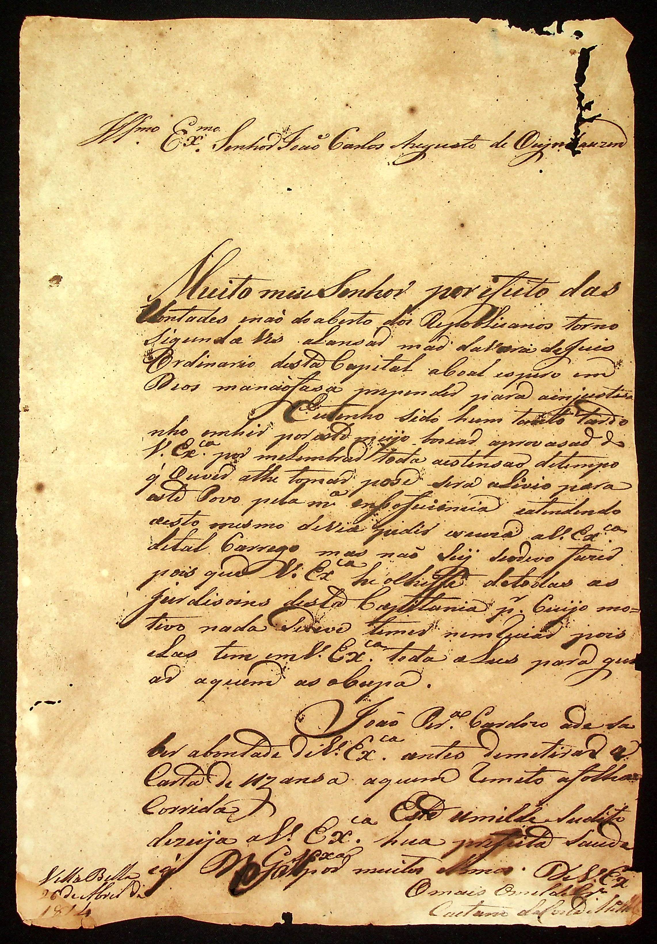 CARTA do [Capitão] Caetano da Costa Araújo Melo ao [Governador e Capitão-General da Capitania de Mato Grosso] João Carlos Augusto d’Oeynhausen e Gravenberg.