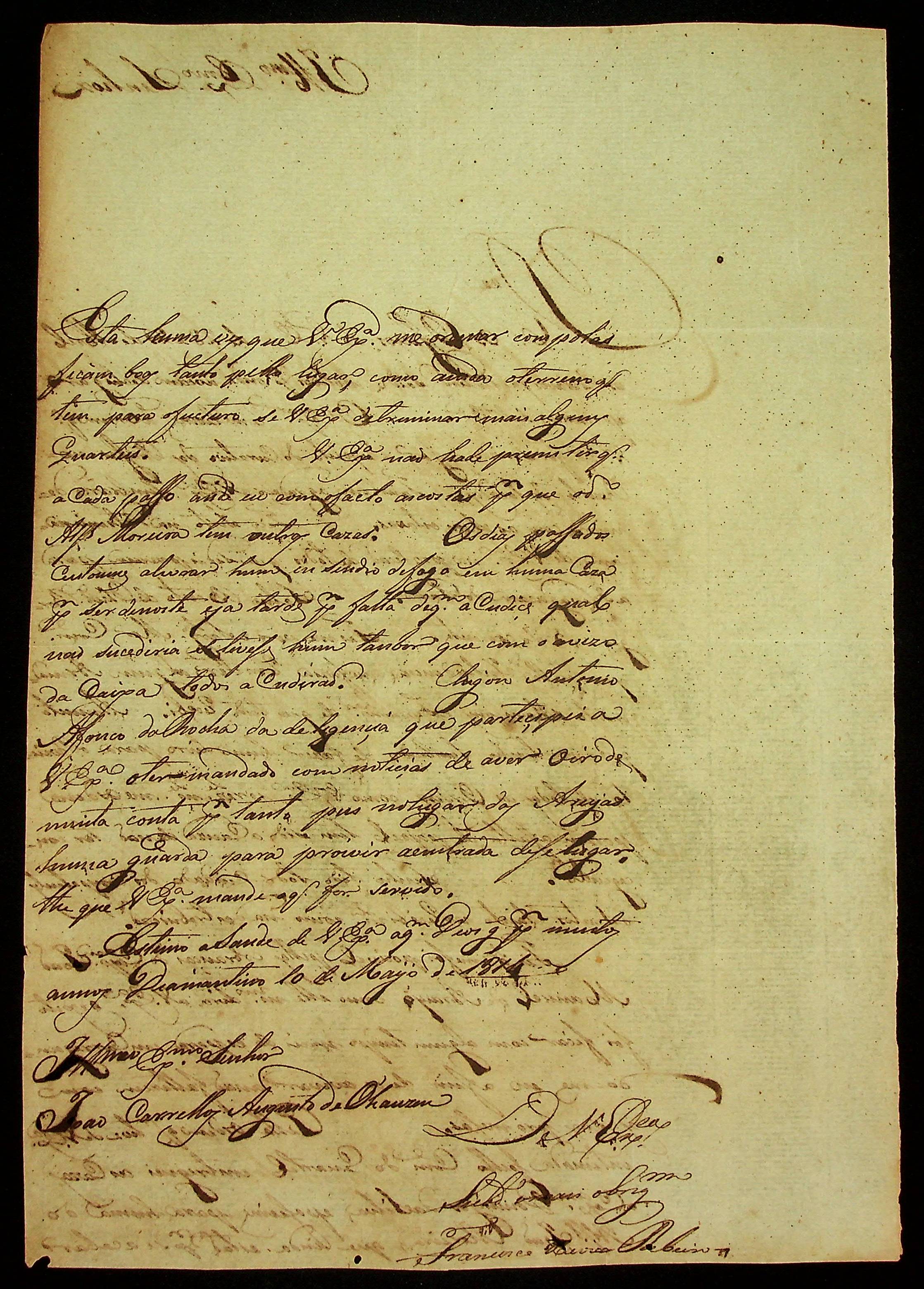 CARTA de Francisco Xavier Ribeiro ao [Governador e Capitão-General da Capitania de Mato Grosso] João Carlos Augusto d’Oeynhausen e Gravenberg.