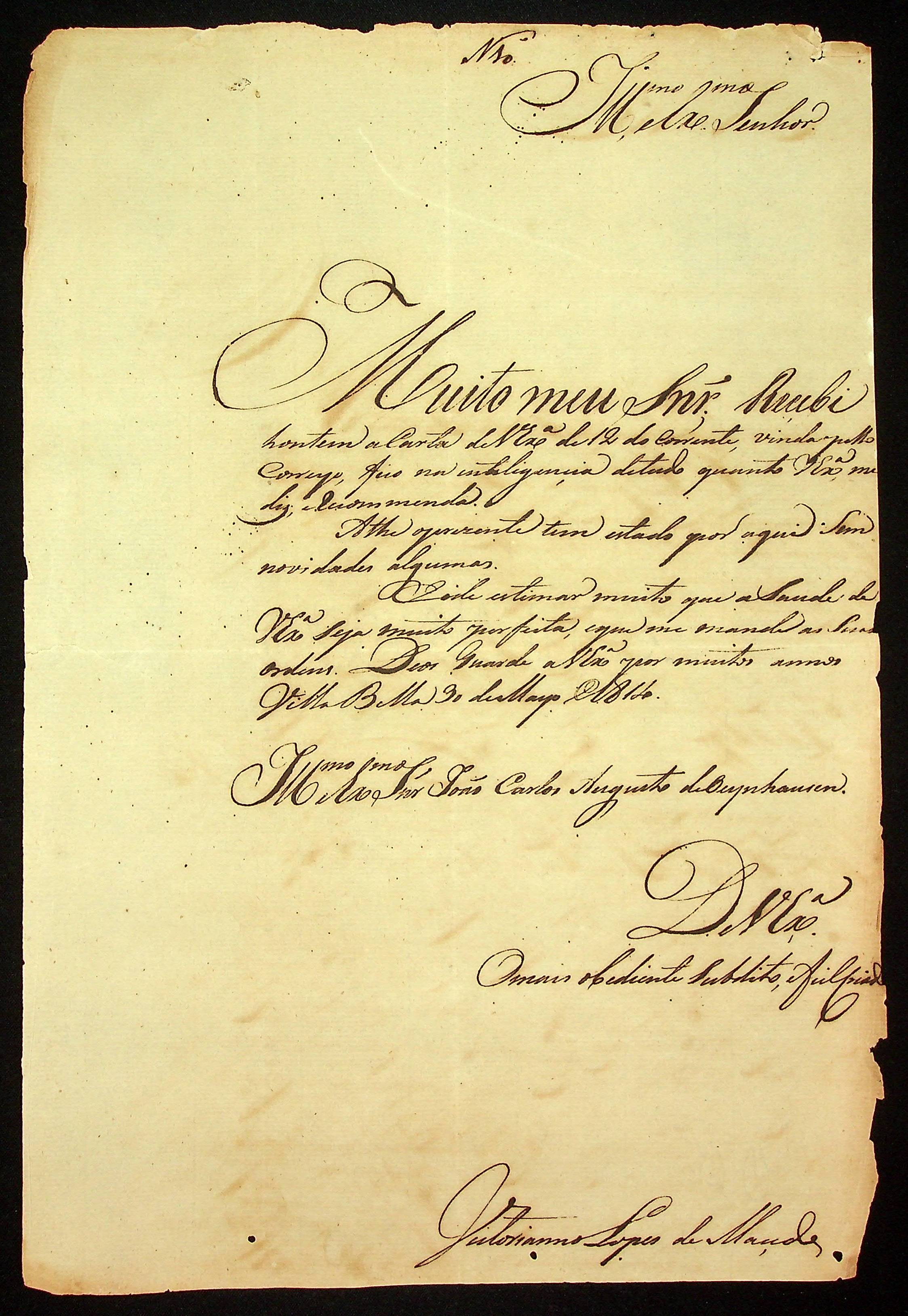 CARTA do [Tenente-Coronel] Vitoriano Lopes de Macedo ao [Governador e Capitão-General da Capitania de Mato Grosso] João Carlos Augusto d’Oeynhausen e Gravenberg.