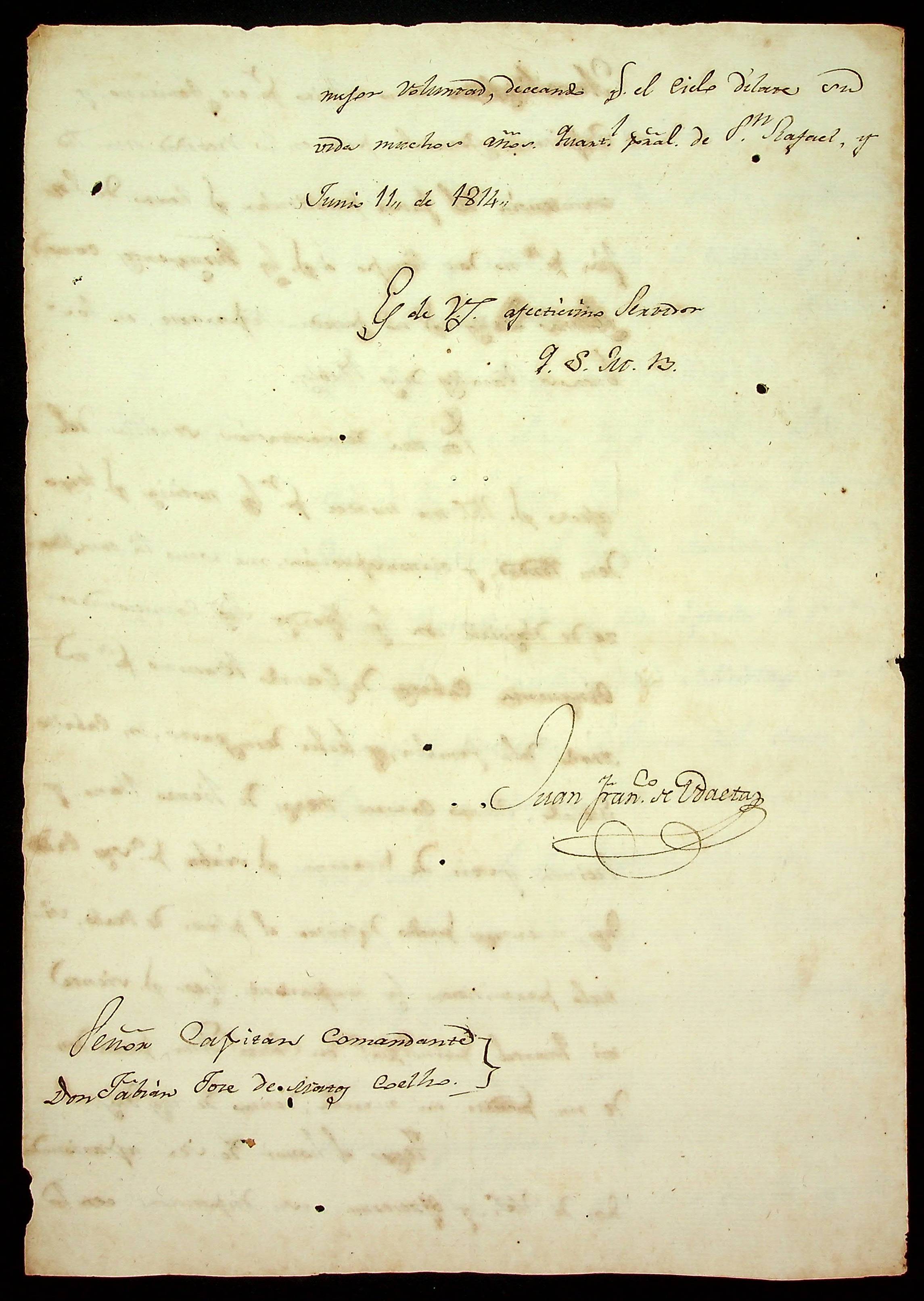 CARTA de Juan Francisco de […] ao Capitão Comandante Flaviano José Matos Coelho.
