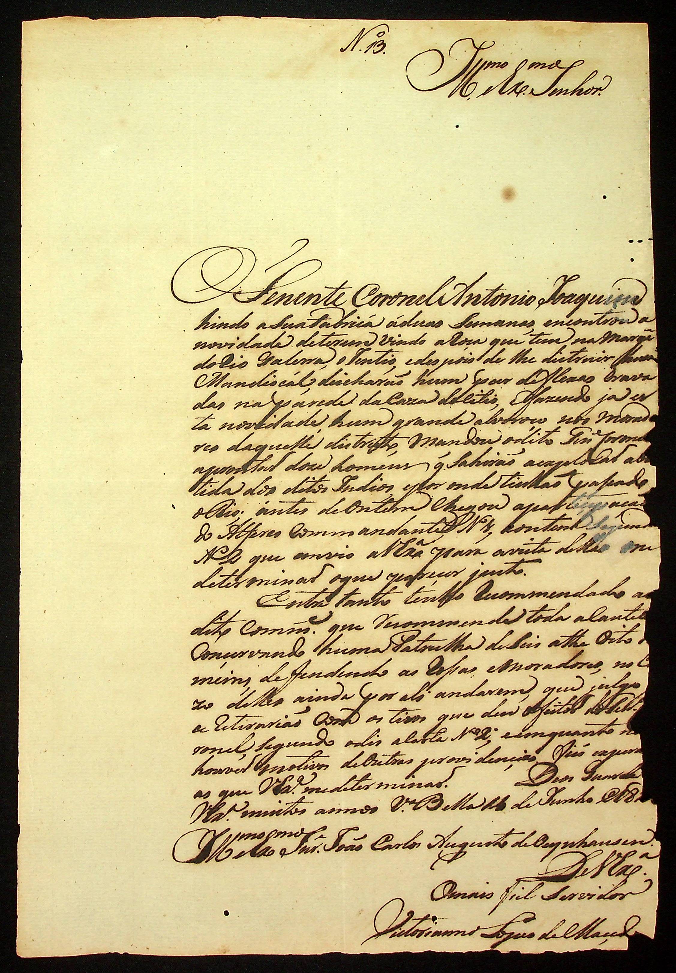 CARTA do [Tenente-Coronel] Vitoriano Lopes de Macedo ao [Governador e Capitão-General da Capitania de Mato Grosso] João Carlos Augusto d’Oeynhausen e Gravenberg.