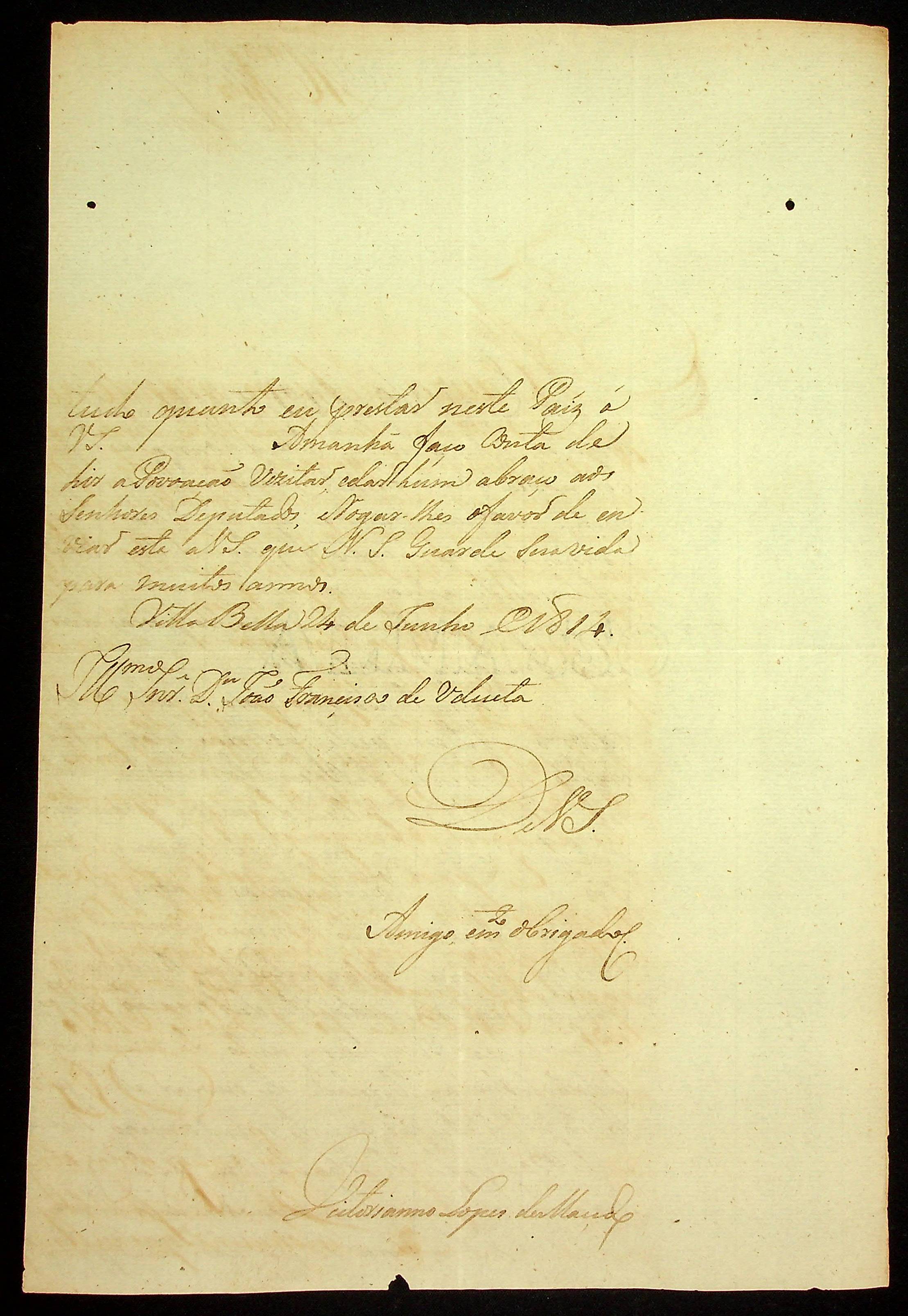 CARTA do [Tenente e Coronel] Vitoriano Lopes de Macedo ao Tenente-Coronel D. João Francisco de [Vrdacta].