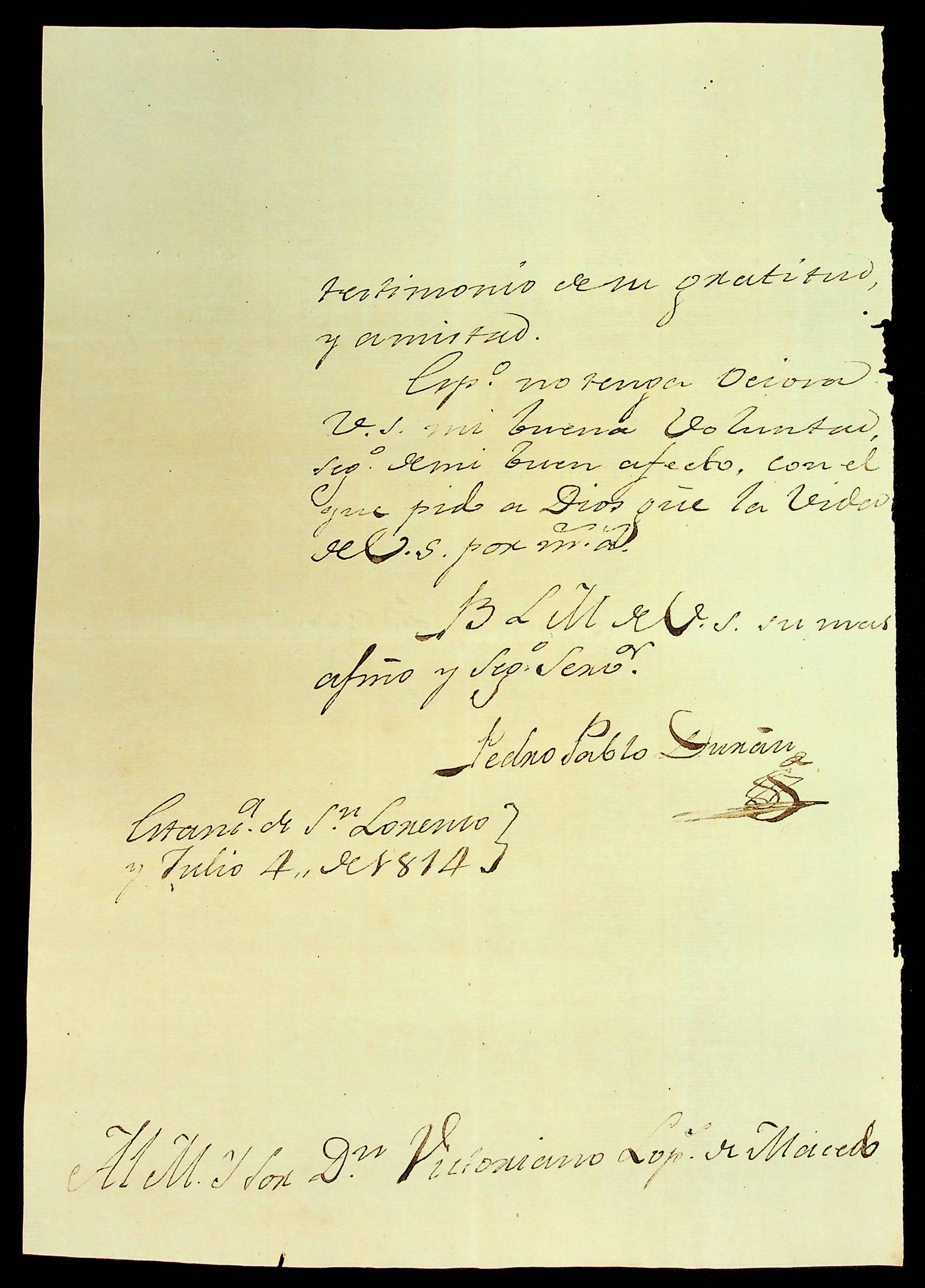 CARTA de Pedro Pablo Duran ao Tenente-Coronel Vitoriano Lopes de Macedo.