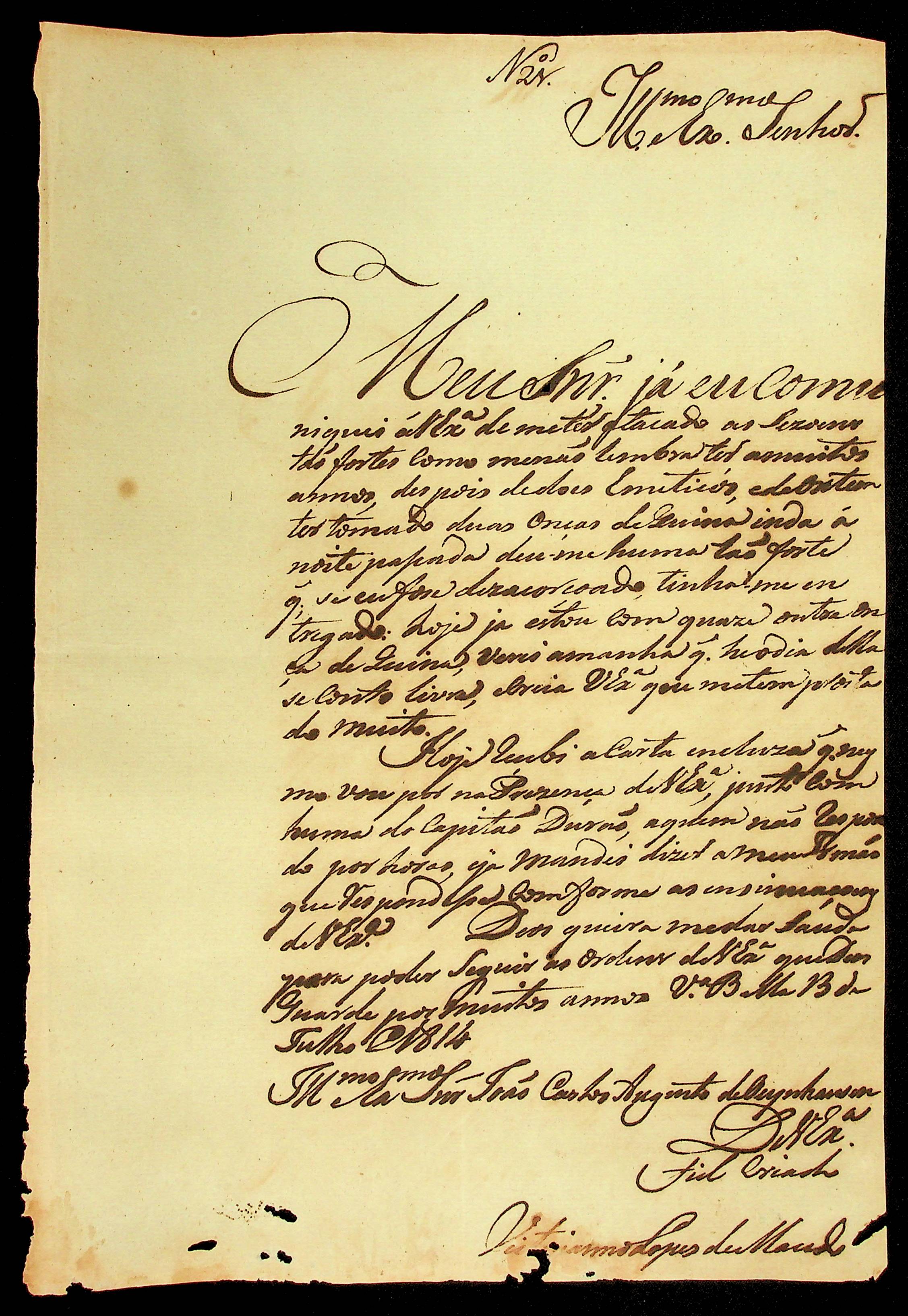 CARTA do [Tenente-Coronel] Comandante [Vitoriano Lopes de Macedo ao [Governador e Capitão-General da Capitania de Mato Grosso] João Carlos Augusto d’Oeynhausen e Gravenberg.