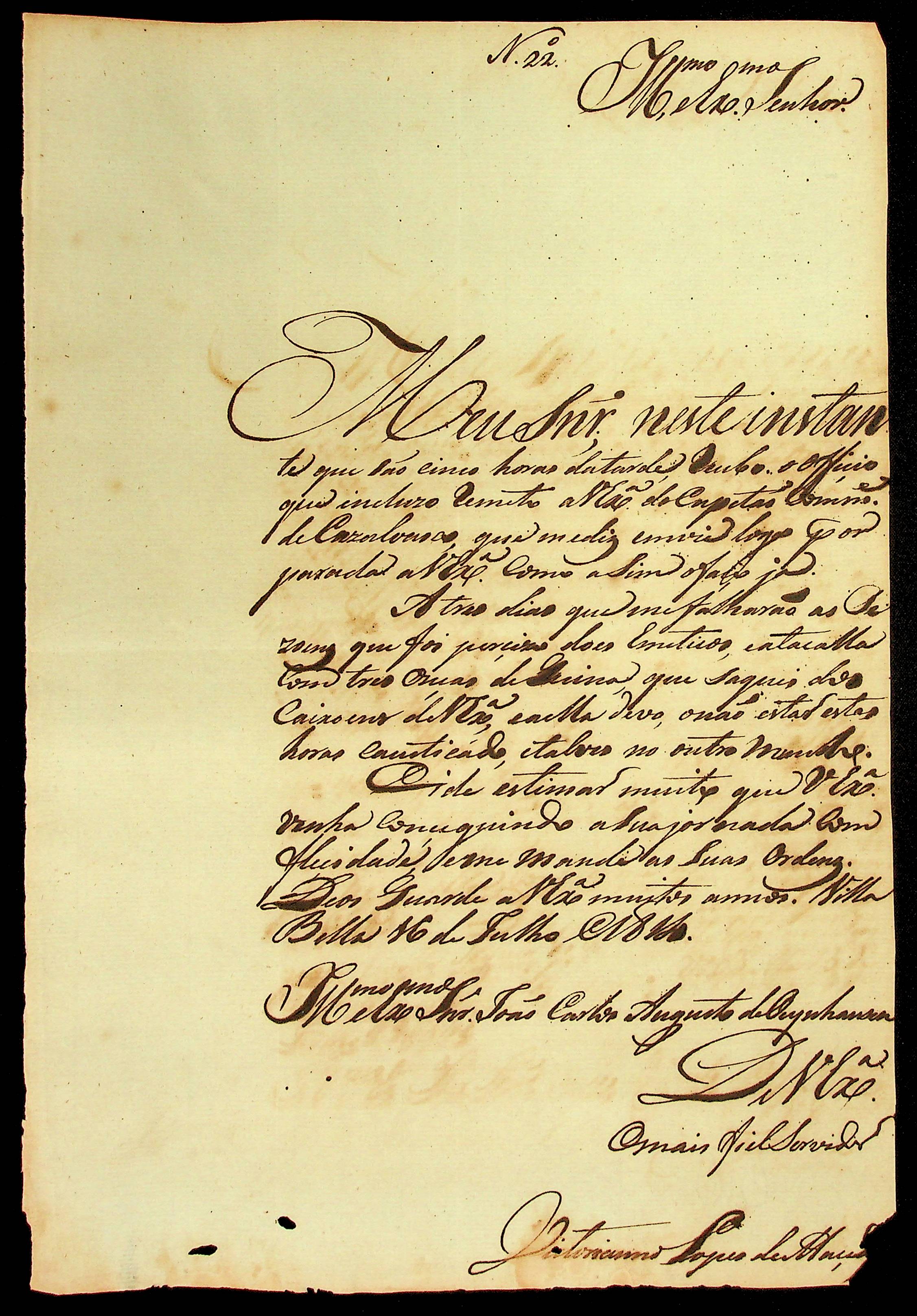 CARTA do [Tenente-Coronel] Vitoriano Lopes de Macedo ao [Governador e Capitão-General da Capitania de Mato Grosso] João Carlos Augusto d’Oeynhausen e Gravenberg.