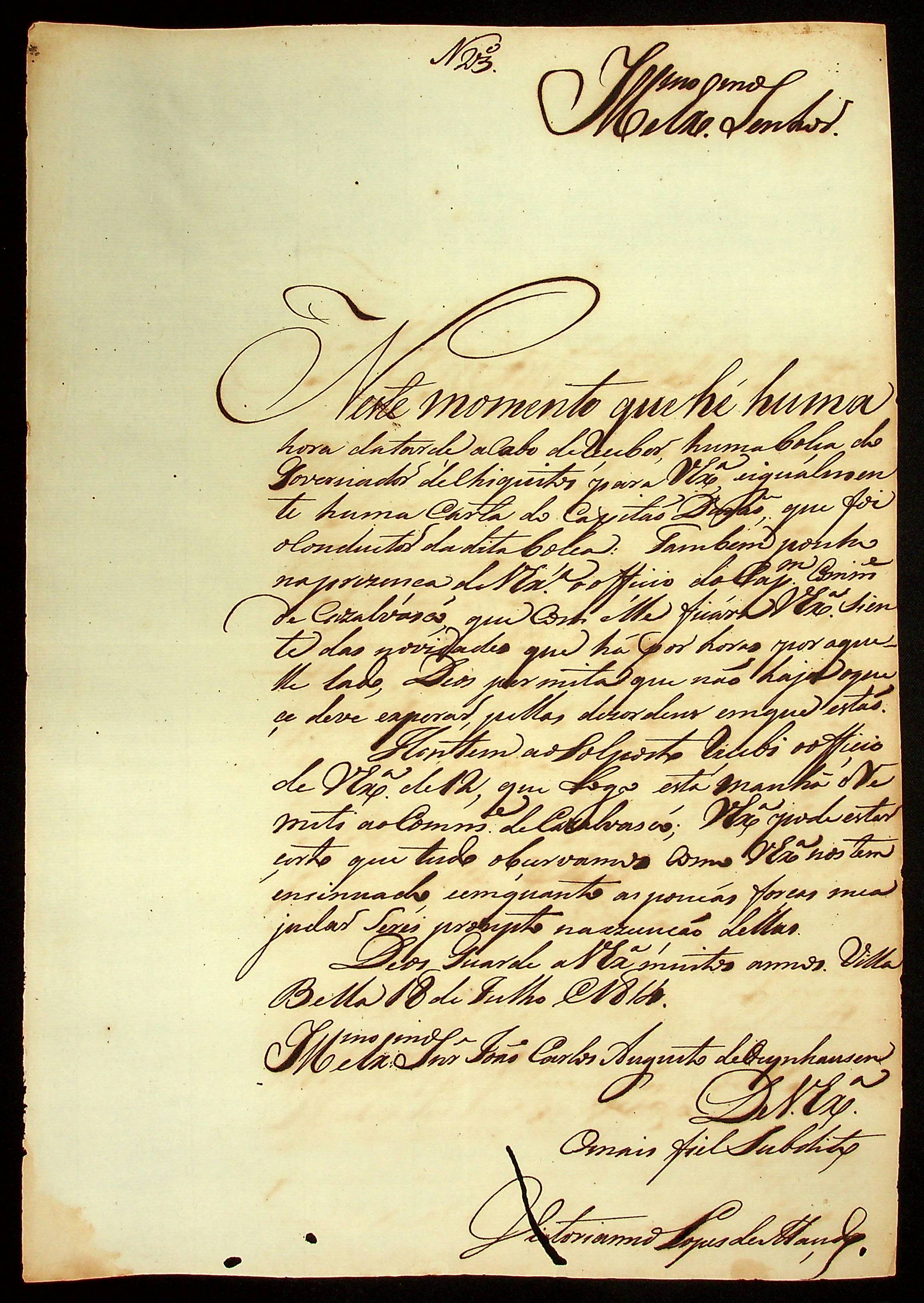 CARTA do [Tenente-Coronel] Vitoriano Lopes de Macedo ao [Governador e Capitão-General da Capitania de Mato Grosso] João Carlos Augusto d’Oeynhausen e Gravenberg.