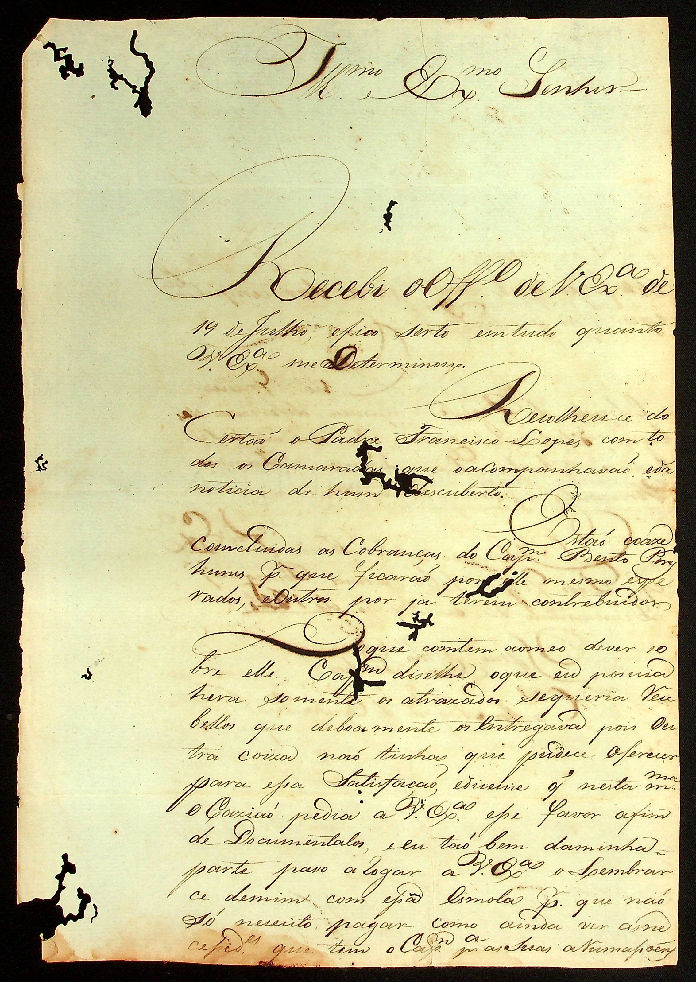 CARTA de Francisco Xavier Ribeiro ao [Governador e Capitão-General da Capitania de Mato Grosso] João Carlos Augusto d’Oeynhausen e Gravenberg.