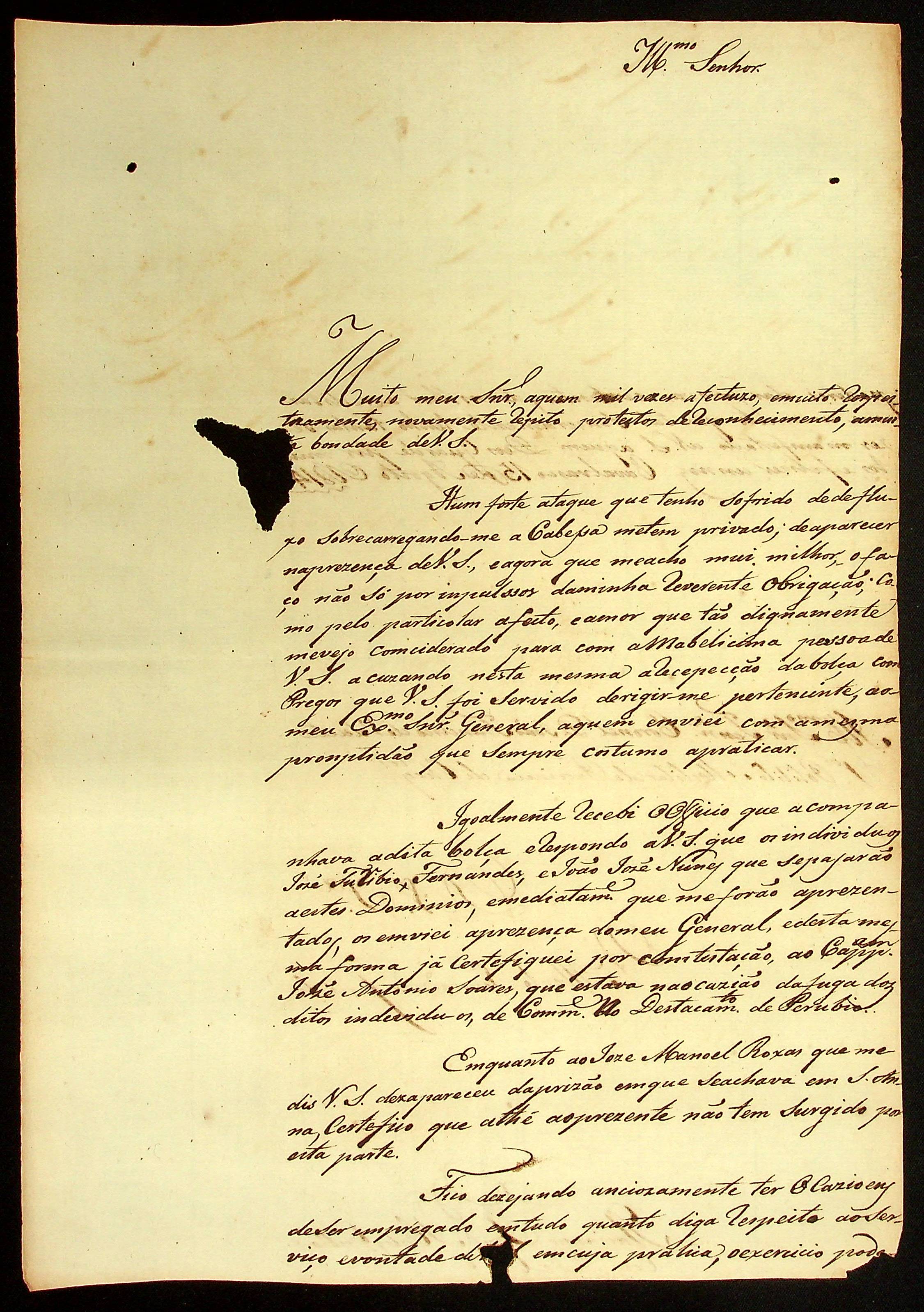 CARTA do [Capitão Comandante de Casalvasco] Flaviano José de Matos Coelho ao [Governador e Capitão-General da Capitania de Mato Grosso] João Carlos Augusto d’Oeynhausen e Gravenberg.