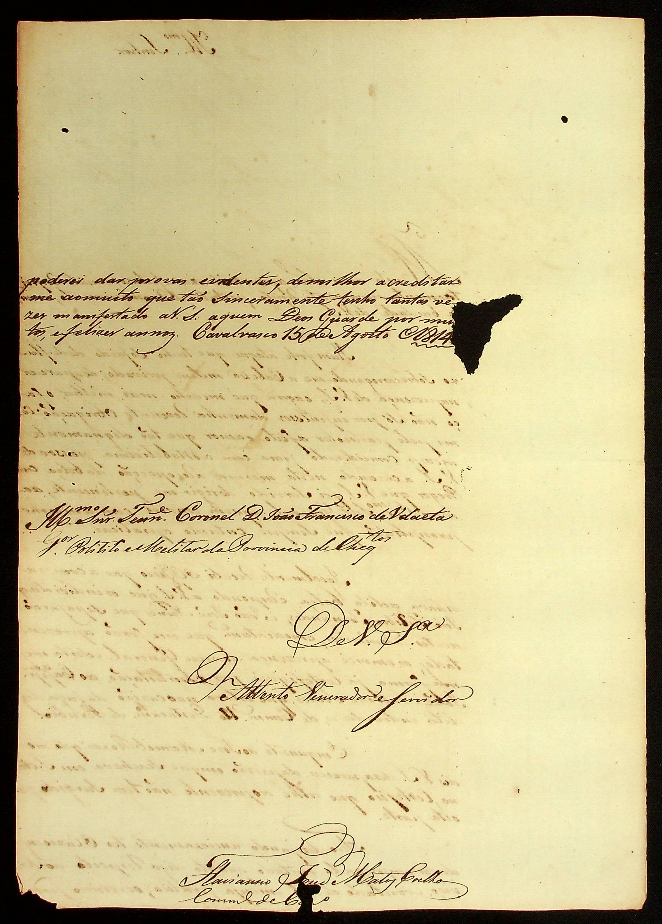 CARTA do [Capitão Comandante de Casalvasco] Flaviano José de Matos Coelho ao [Governador e Capitão-General da Capitania de Mato Grosso] João Carlos Augusto d’Oeynhausen e Gravenberg.