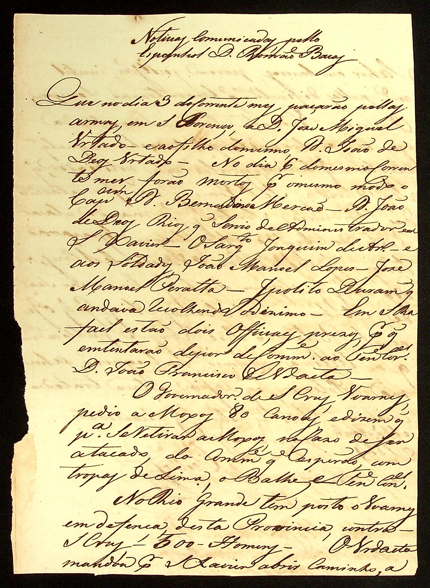 CARTA do [Capitão Comandante de Casalvasco] Flaviano José de Matos Coelho ao [Governador e Capitão-General da Capitania de Mato Grosso] João Carlos Augusto d’Oeynhausen e Gravenberg.