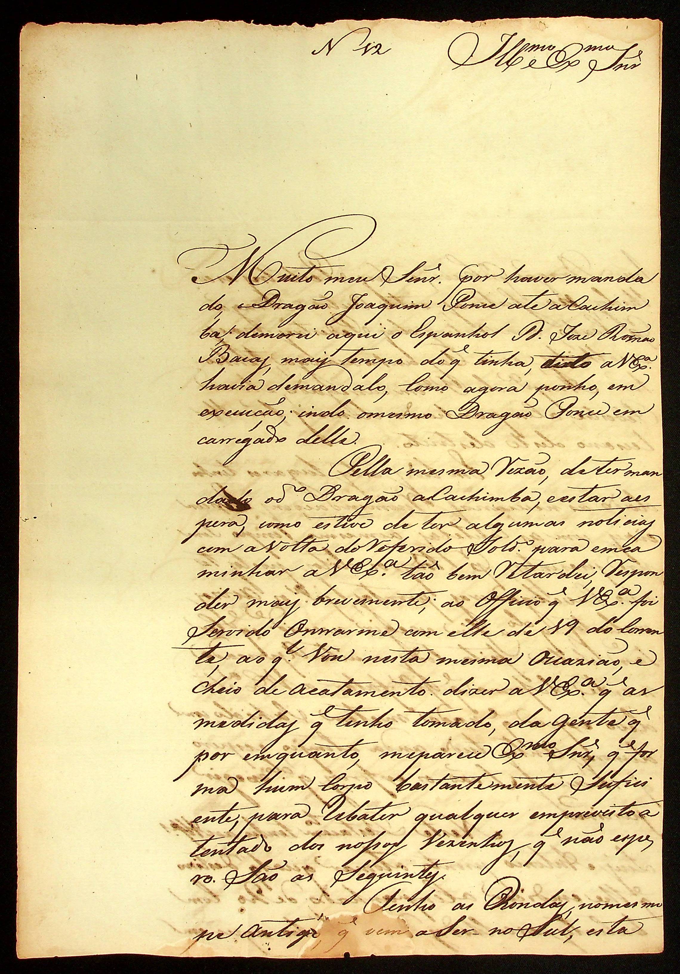 CARTA do [Capitão Comandante de Casalvasco] Flaviano José de Matos Coelho ao [Governador e Capitão General da Capitania de Mato Grosso] João Carlos Augusto D´Oeynhausen e Gravemberg.