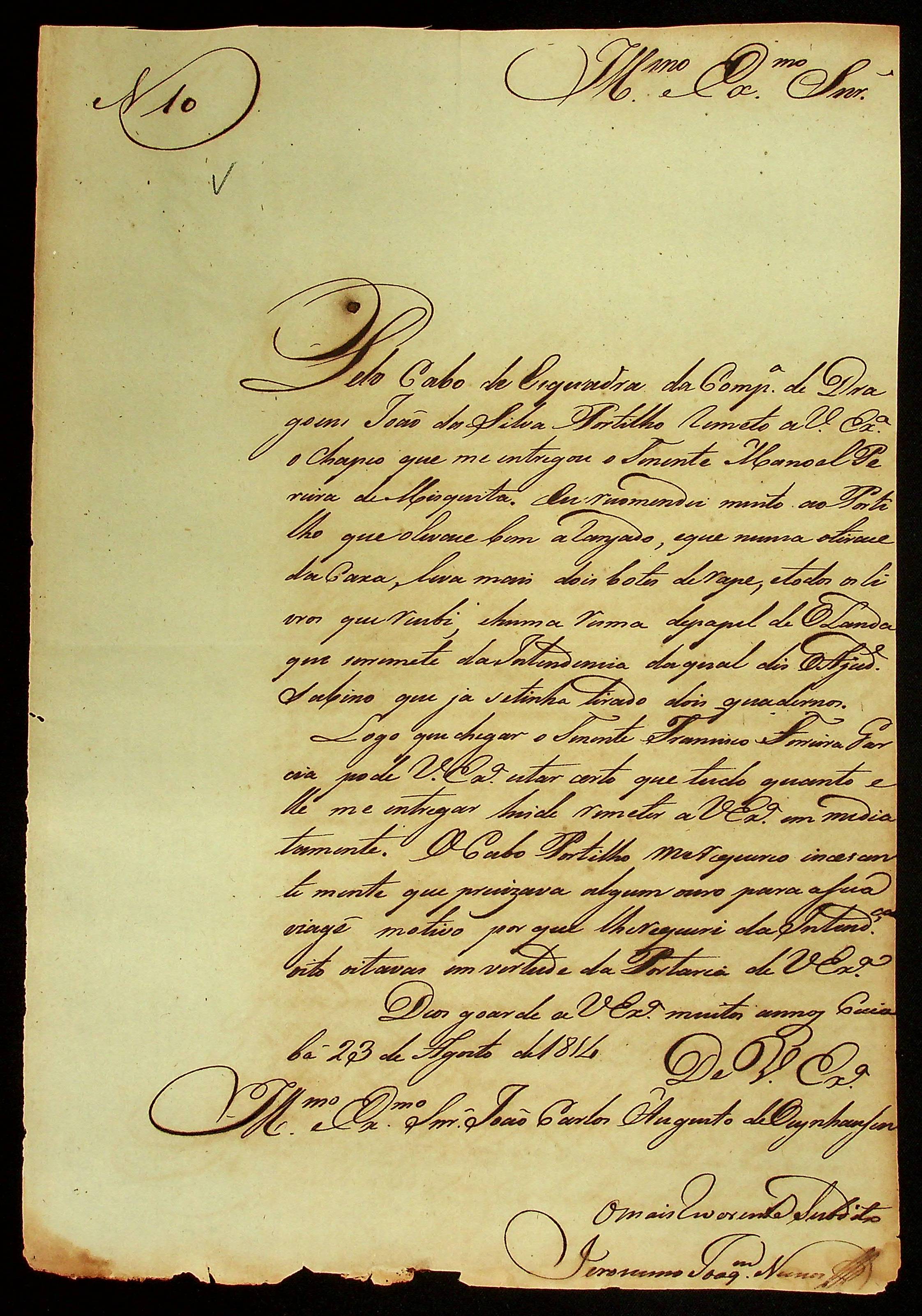 CARTA do [Sargento-mor ]Jeronimo Joaquim Nunes ao [Governador e Capitão-General da Capitania de Mato Grosso] João Carlos Augusto D´Oeynhausen e Gravemberg.