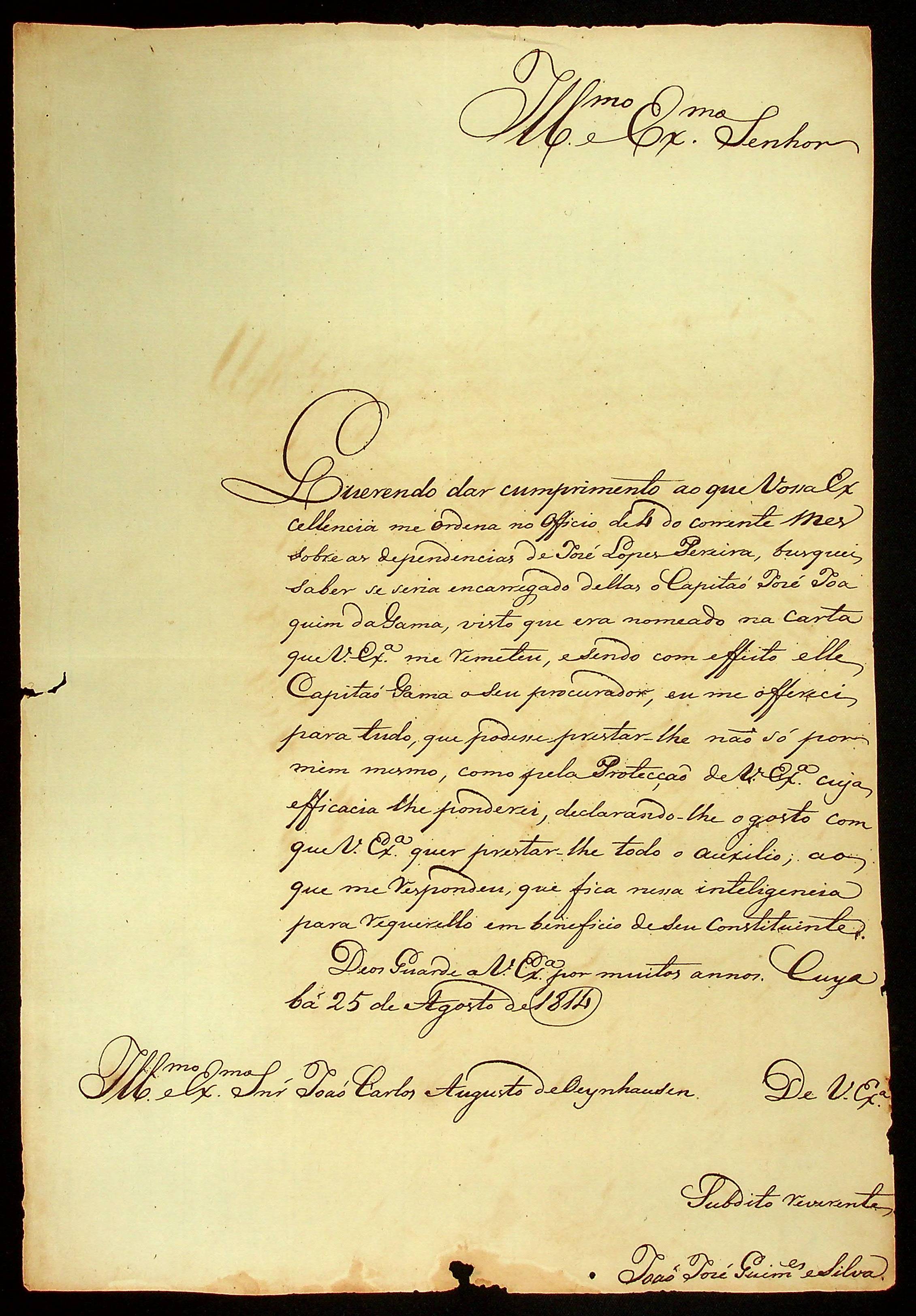 CARTA do [Capitão] João José Guimarães e Silva ao [Governador e Capitão-General da Capitania de Mato Grosso] João Carlos Augusto D´Oeynhausen e Gravemberg.