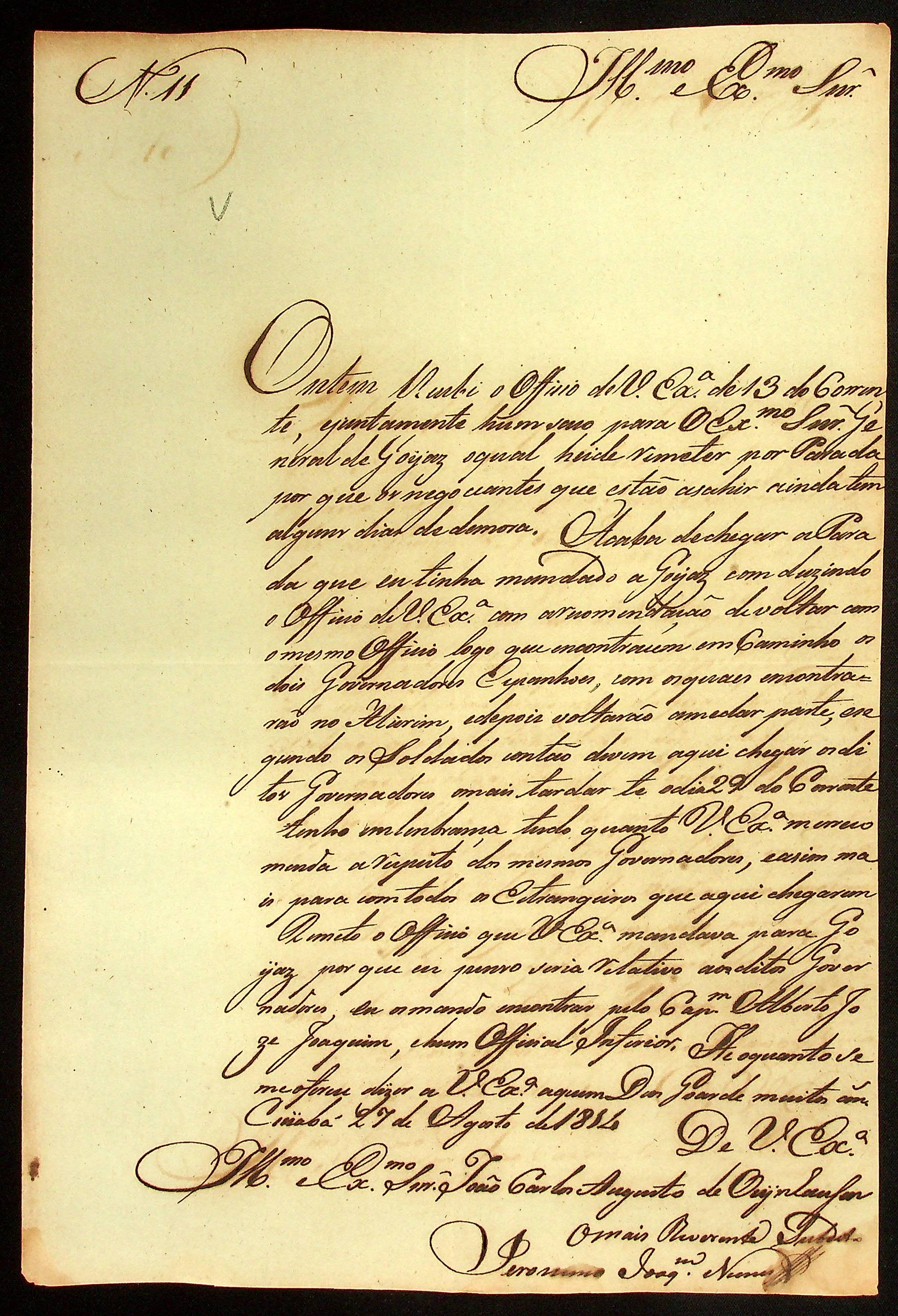 CARTA do [Sargento-mor] Jeronimo Joaquim Nunes ao [Governador e Capitão-General da Capitania de Mato Grosso] João Carlos Augusto D´Oeynhausen e Gravemberg.