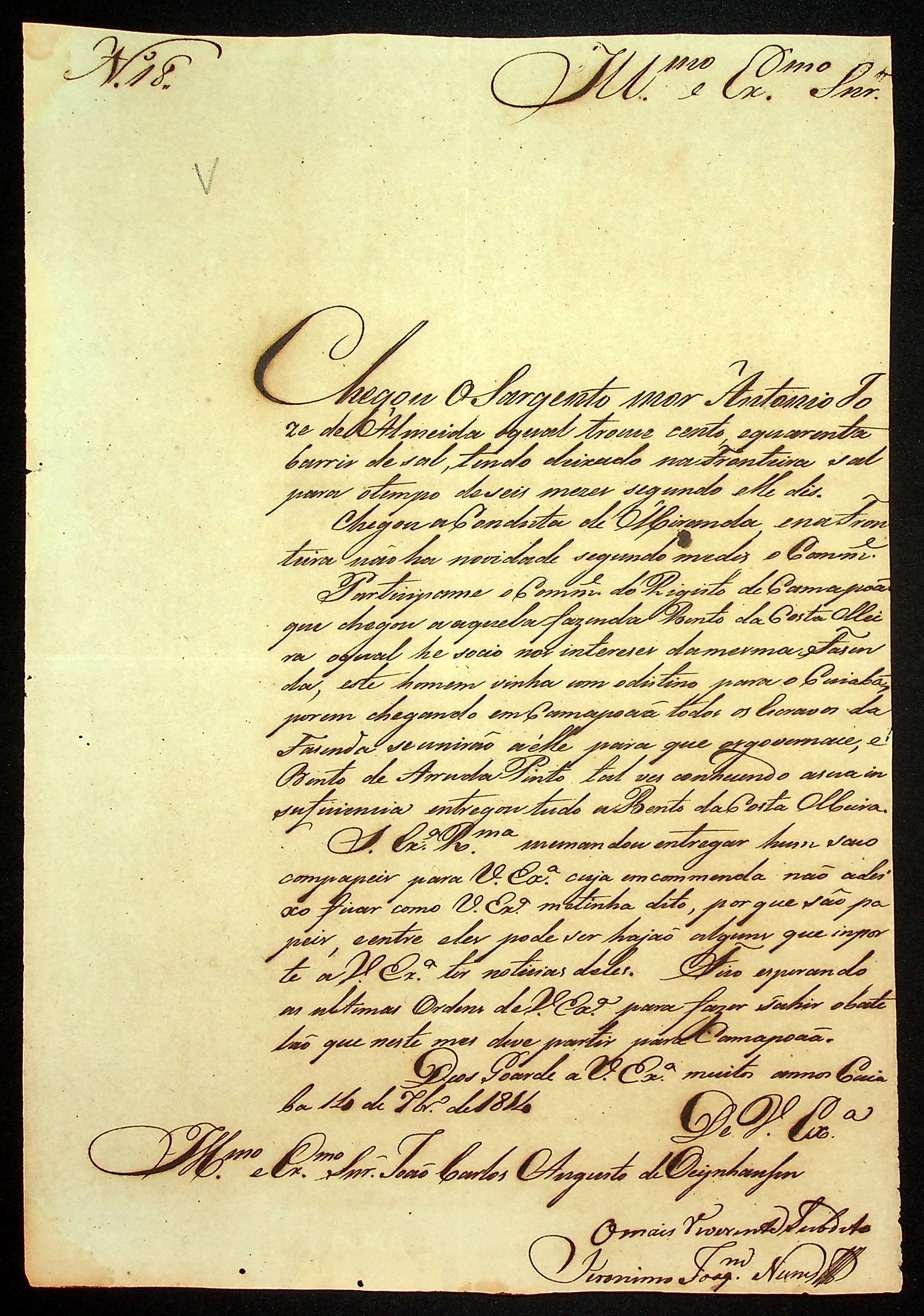 CARTA do [Sargento-mor] Jerônimo Joaquim Nunes ao [Governador e Capitão-General da Capitania de Mato Grosso] João Carlos Augusto d’Oeynhausen e Gravenberg.
