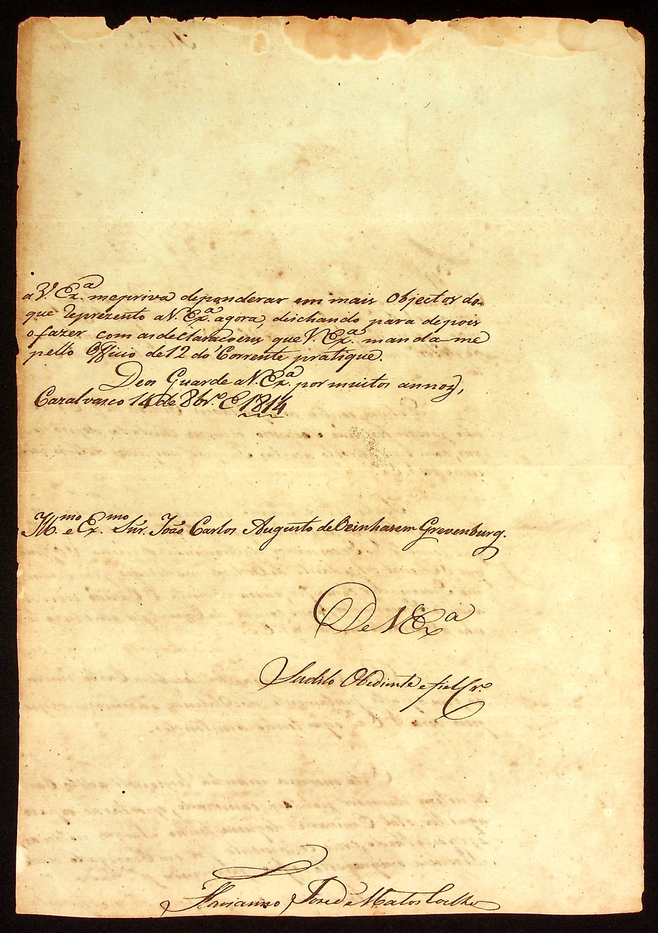CARTA do [Capitão Comandante de Casalvasco] Flaviano José de Matos Coelho ao [Governador e Capitão General da Capitania de Mato Grosso] João Carlos Augusto D´ Oeynhausen e Gravenberg.