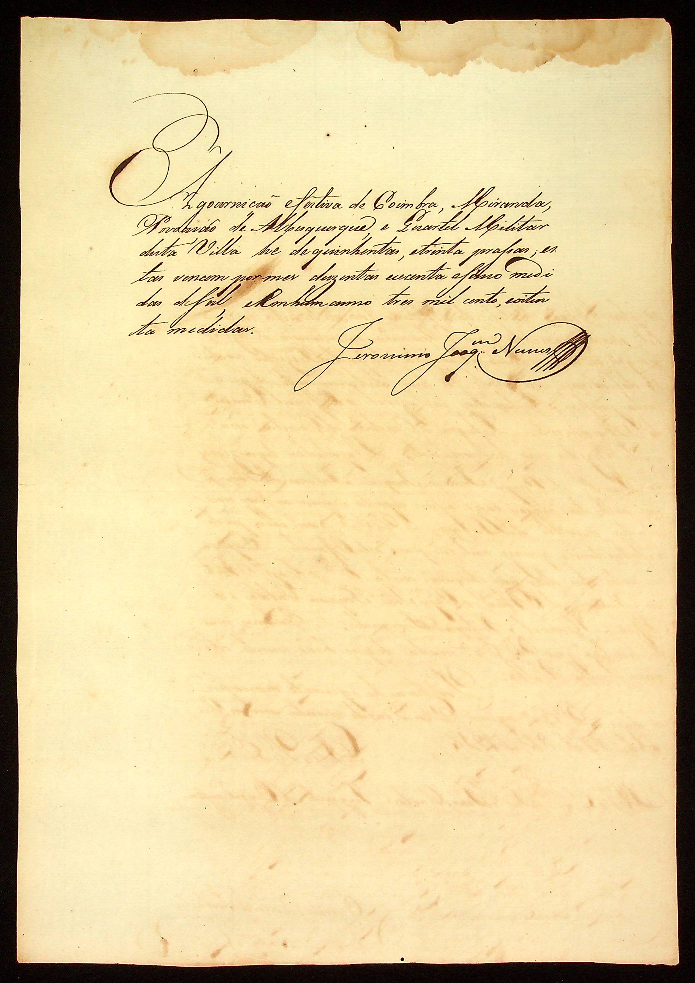 CARTA do [Sargento-mor] Jerônimo Joaquim Nunes ao [Governador e Capitão-General da Capitania de Mato Grosso] João Carlos Augusto D´ Oeynhausen e Gravenberg.