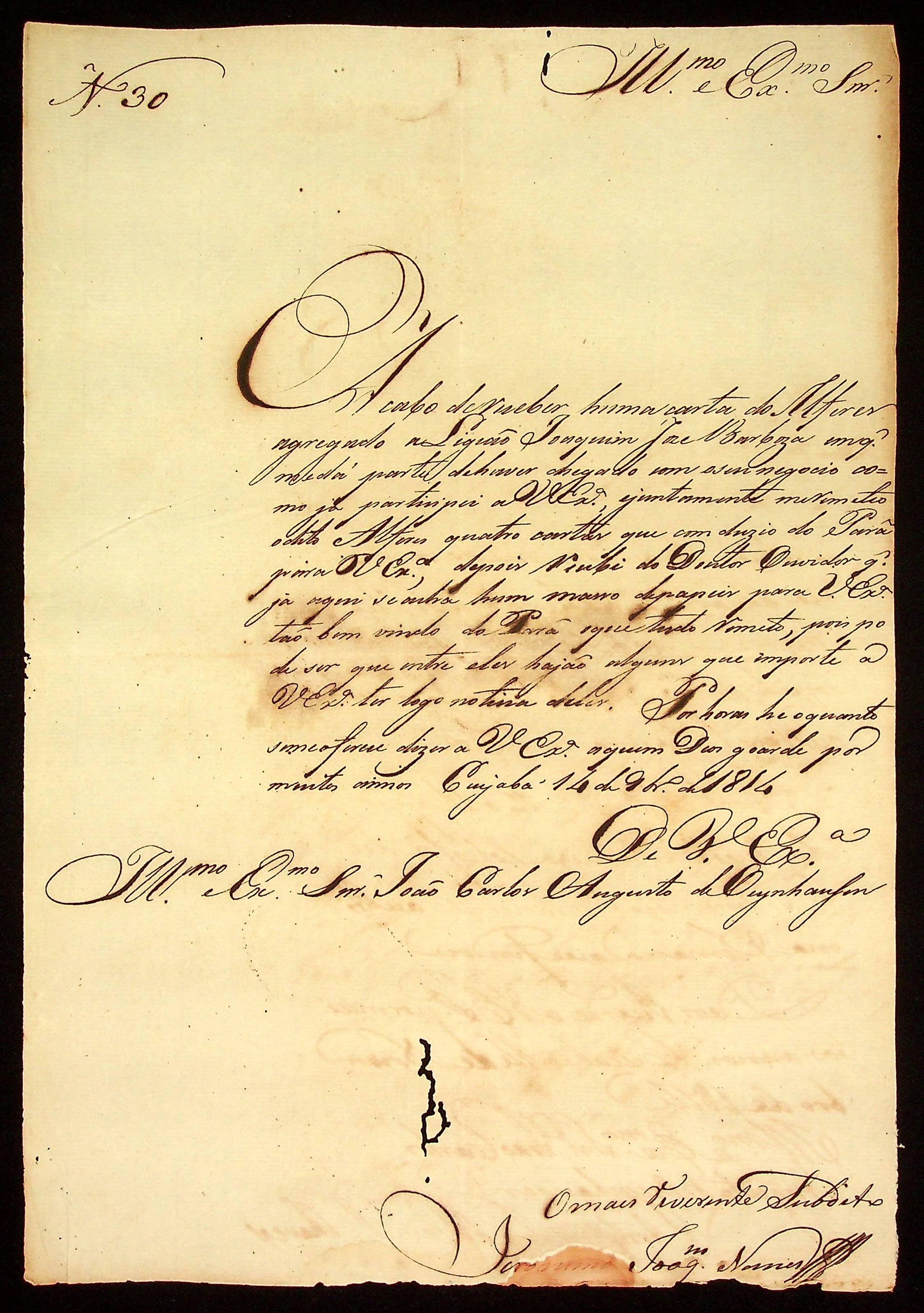 CARTA do [Sargento-mor] Jerônimo Joaquim Nunes ao [Governador e Capitão-General da Capitania de Mato Grosso] João Carlos Augusto d’Oeynhausen e Gravenberg.