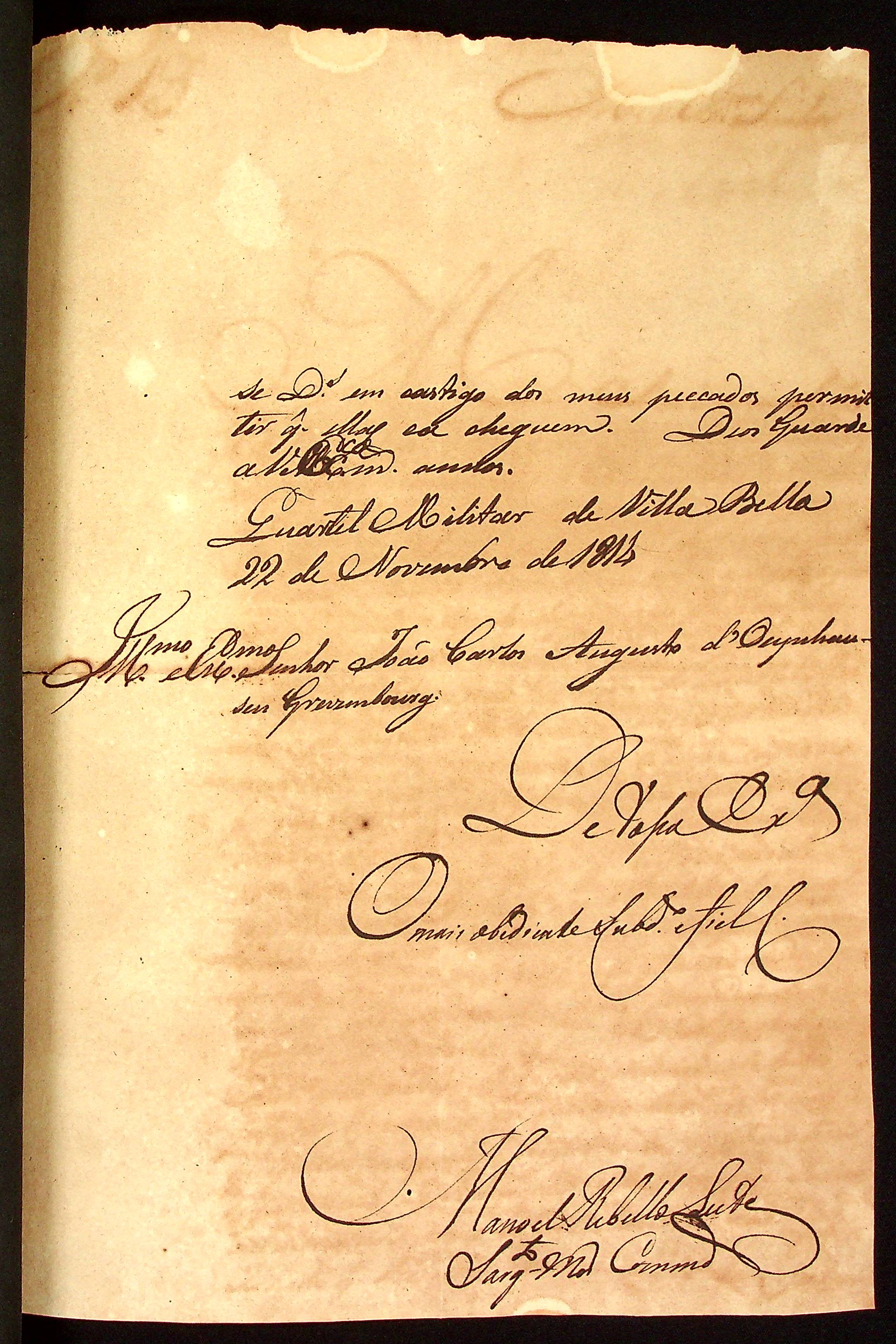 CARTA do [Sargento-mor] Manoel [Rabelo] Leite ao [Governador e Capitão-General da Capitania de Mato Grosso [João Carlos Augusto d’Oeynhausen e Gravenberg.