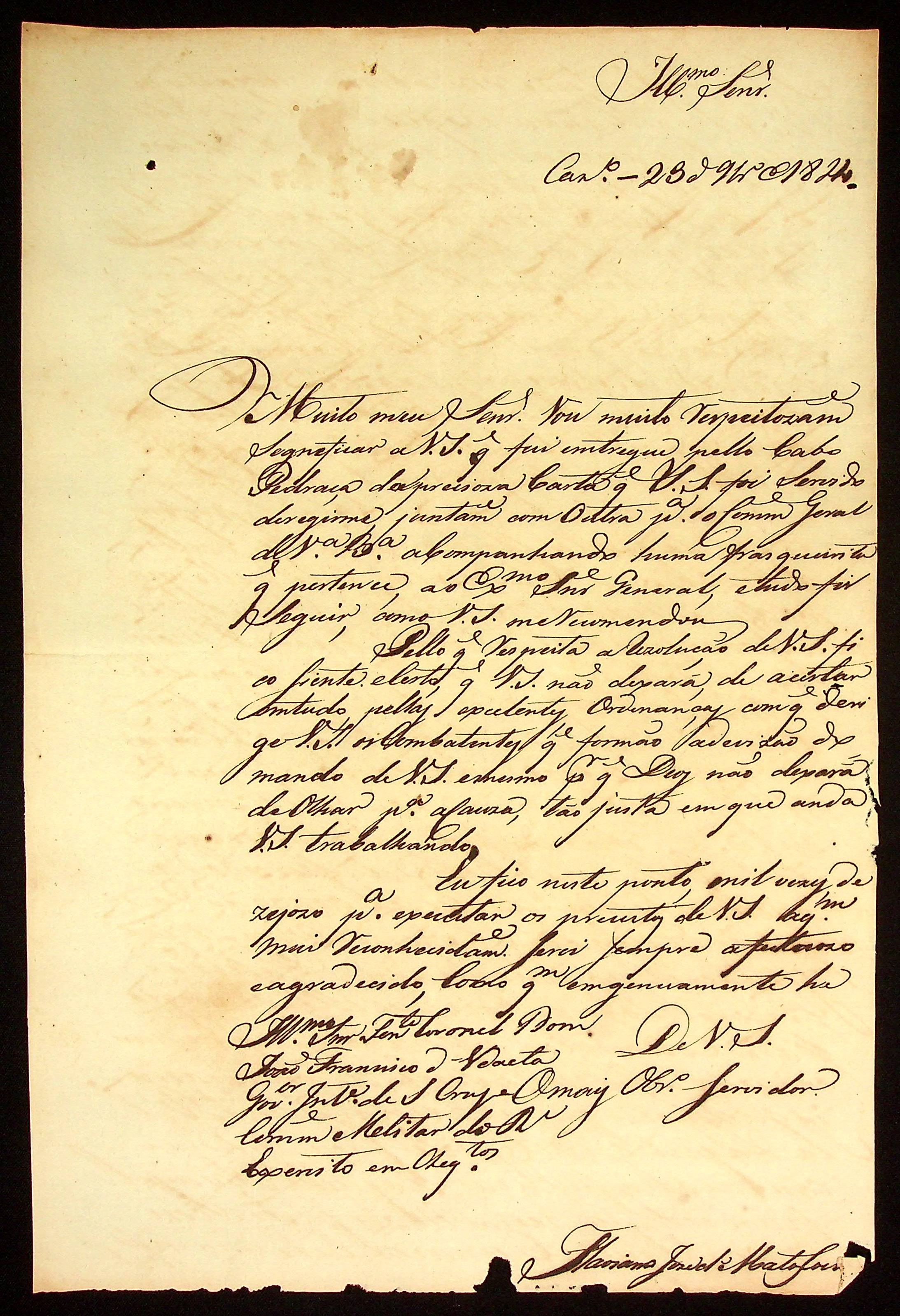 CARTA do [Capitão Comandante de Casalvasco] Flaviano José de Matos Coelho ao [Governador e Capitão General da Capitania de Mato Grosso] João Carlos Augusto d’Oeynhausen e Gravenberg.