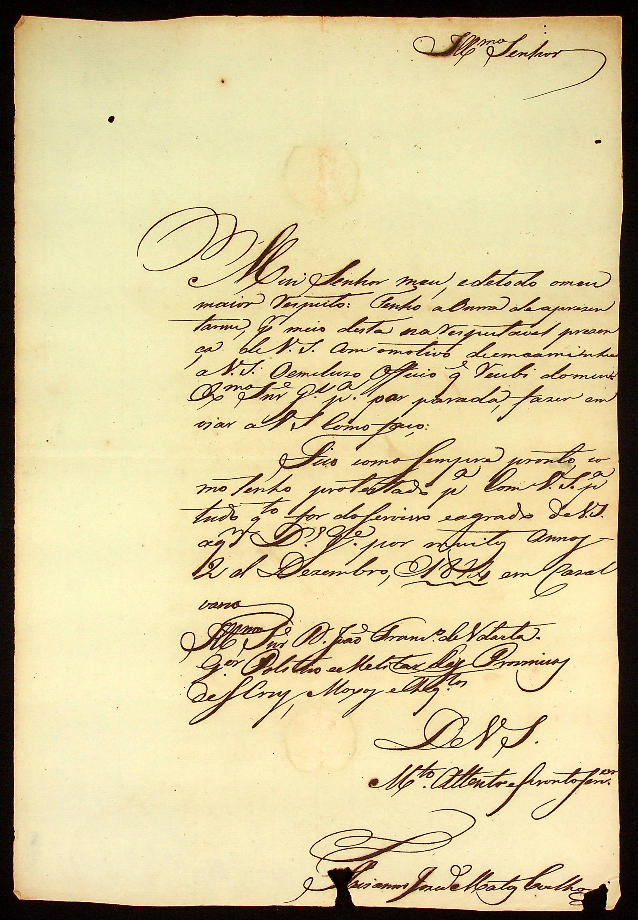 CARTA do [Capitão Comandante de Casalvasco] Flaviano José de Matos Coelho ao [Governador e Capitão General da Capitania de Mato Grosso] João Carlos Augusto d’Oeynhausen e Gravenberg.