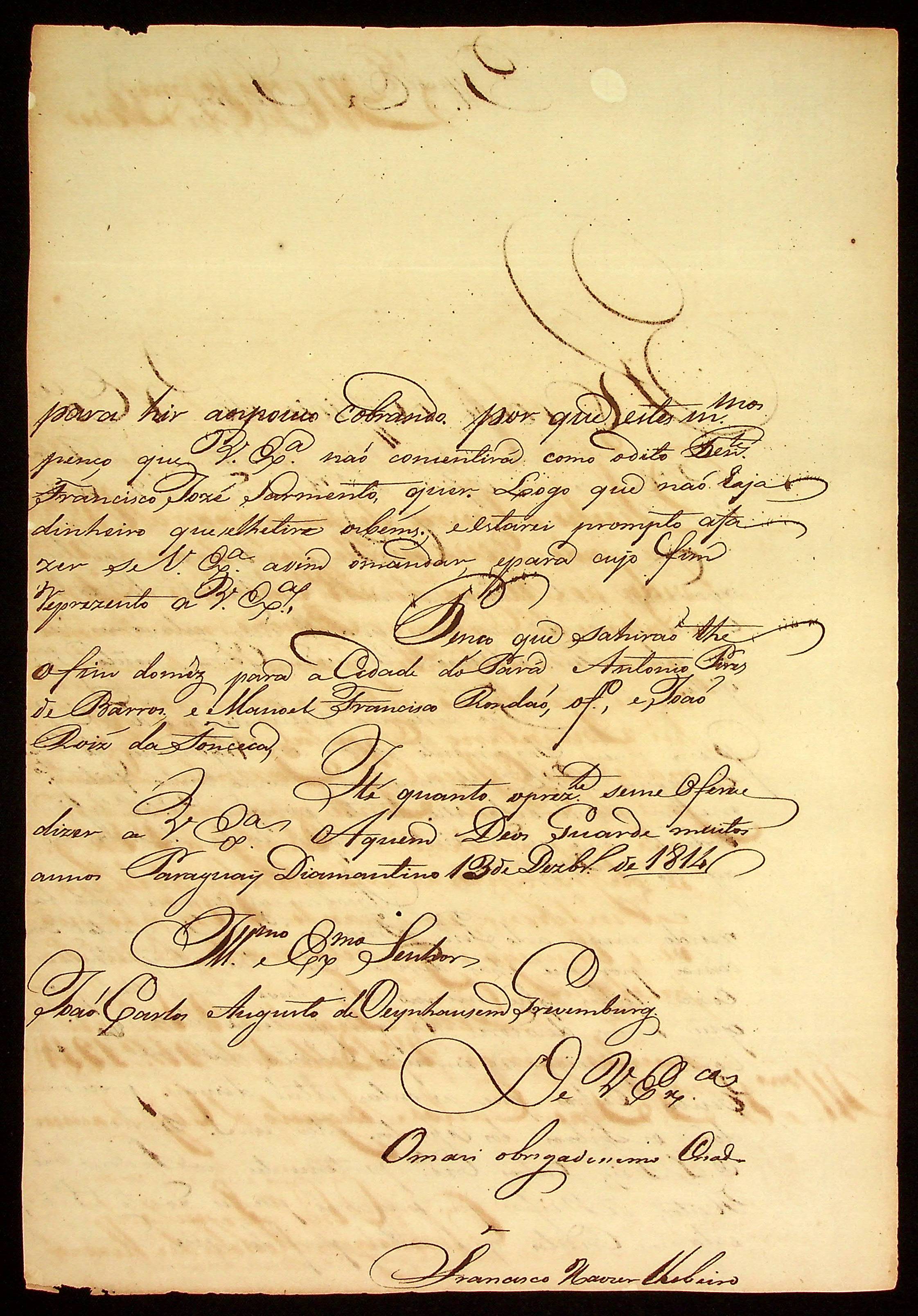CARTA de Francisco Xavier Ribeiro ao [Governador e Capitão-General da Capitania de Mato Grosso] João Carlos Augusto d’Oeynhausen e Gravenberg.