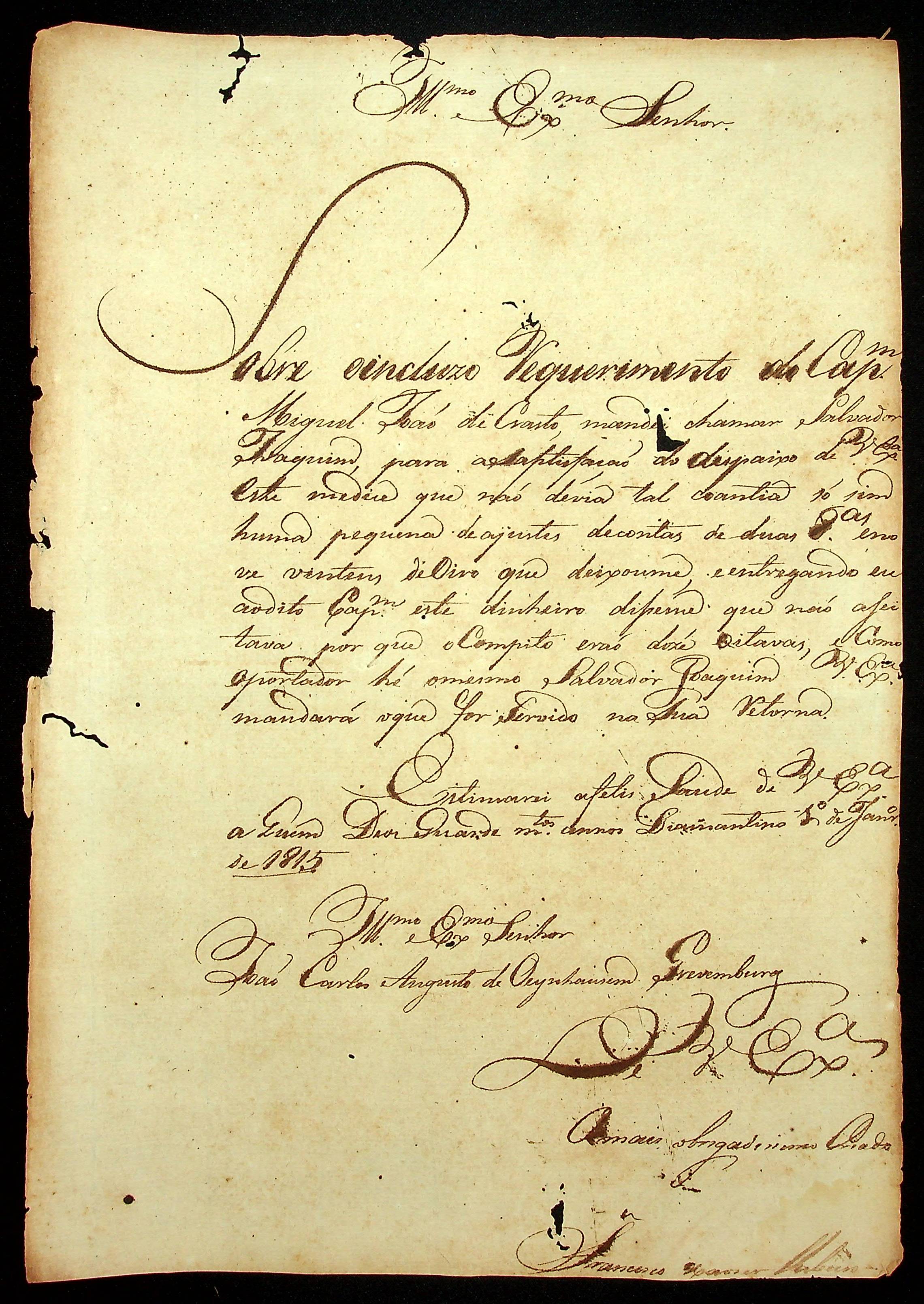 CARTA de Francisco Xavier Ribeiro ao [Governador e Capitão-General da Capitania de Mato Grosso] João Carlos Augusto d’Oeynhausen e Gravenberg.