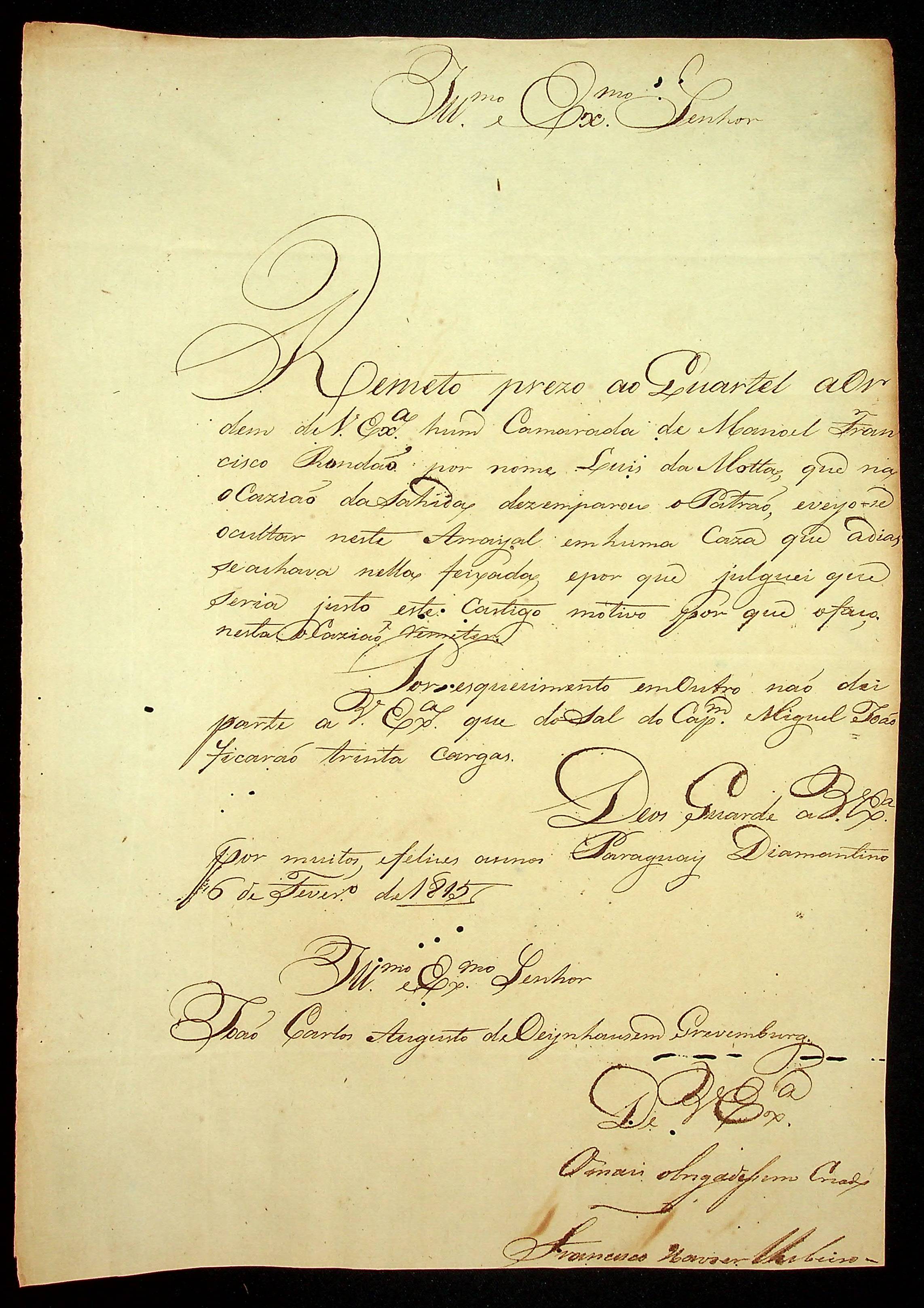 CARTA de Francisco Xavier Ribeiro ao [Governador e Capitão-General da Capitania de Mato Grosso] João Carlos Augusto d’Oeynhausen e Gravenberg.