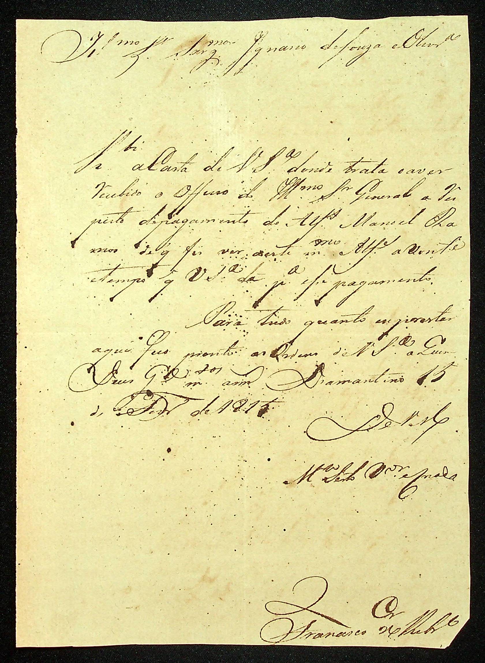 CARTA de Francisco Xavier Ribeiro ao Sargento Ignácio de Souza e Oliveira.