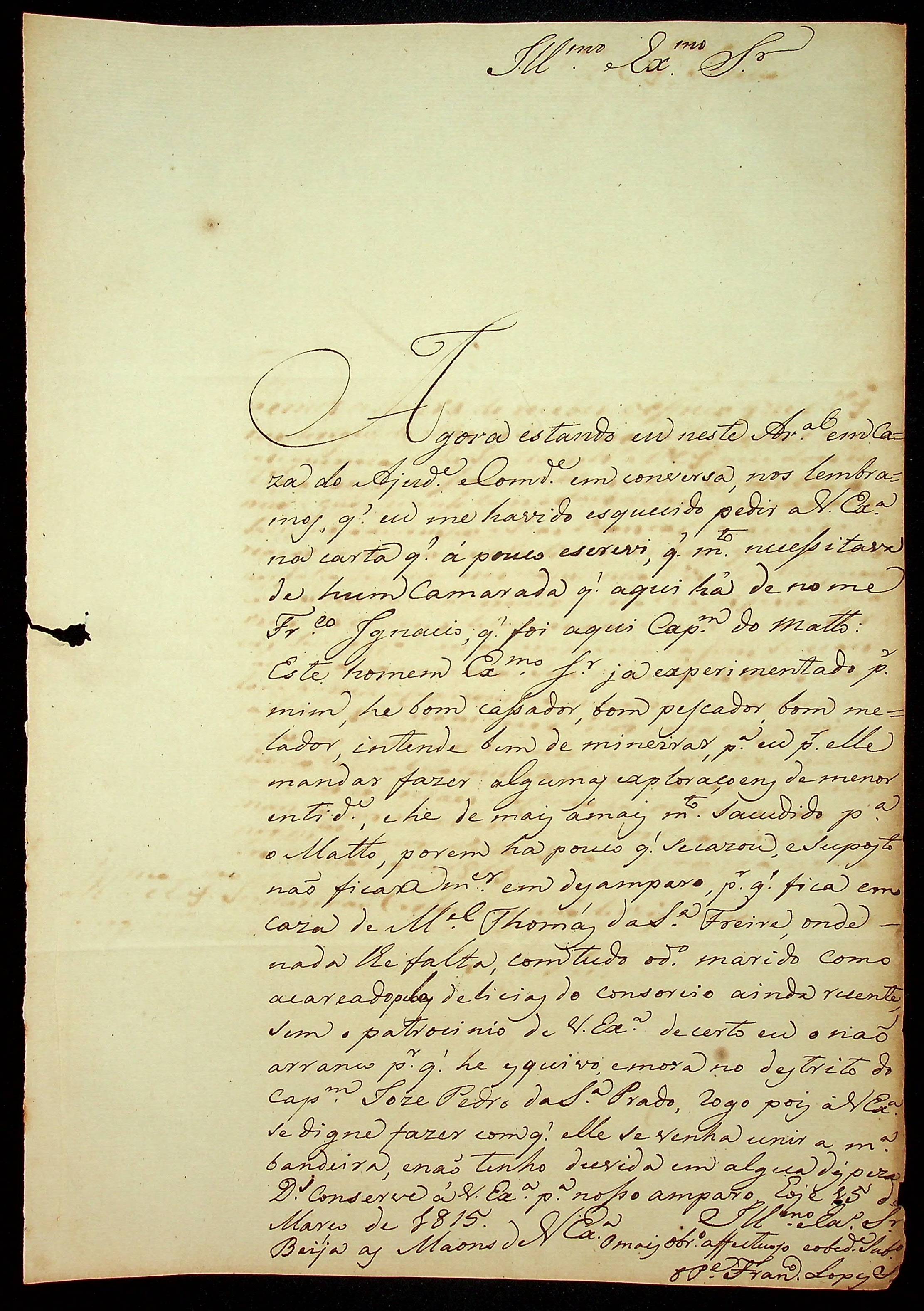 CARTA do [Pedestre] Francisco Lopes ao [Governador e Capitão-General da Capitania de Mato Grosso] João Carlos Augusto d’Oeynhausen e Gravenberg.