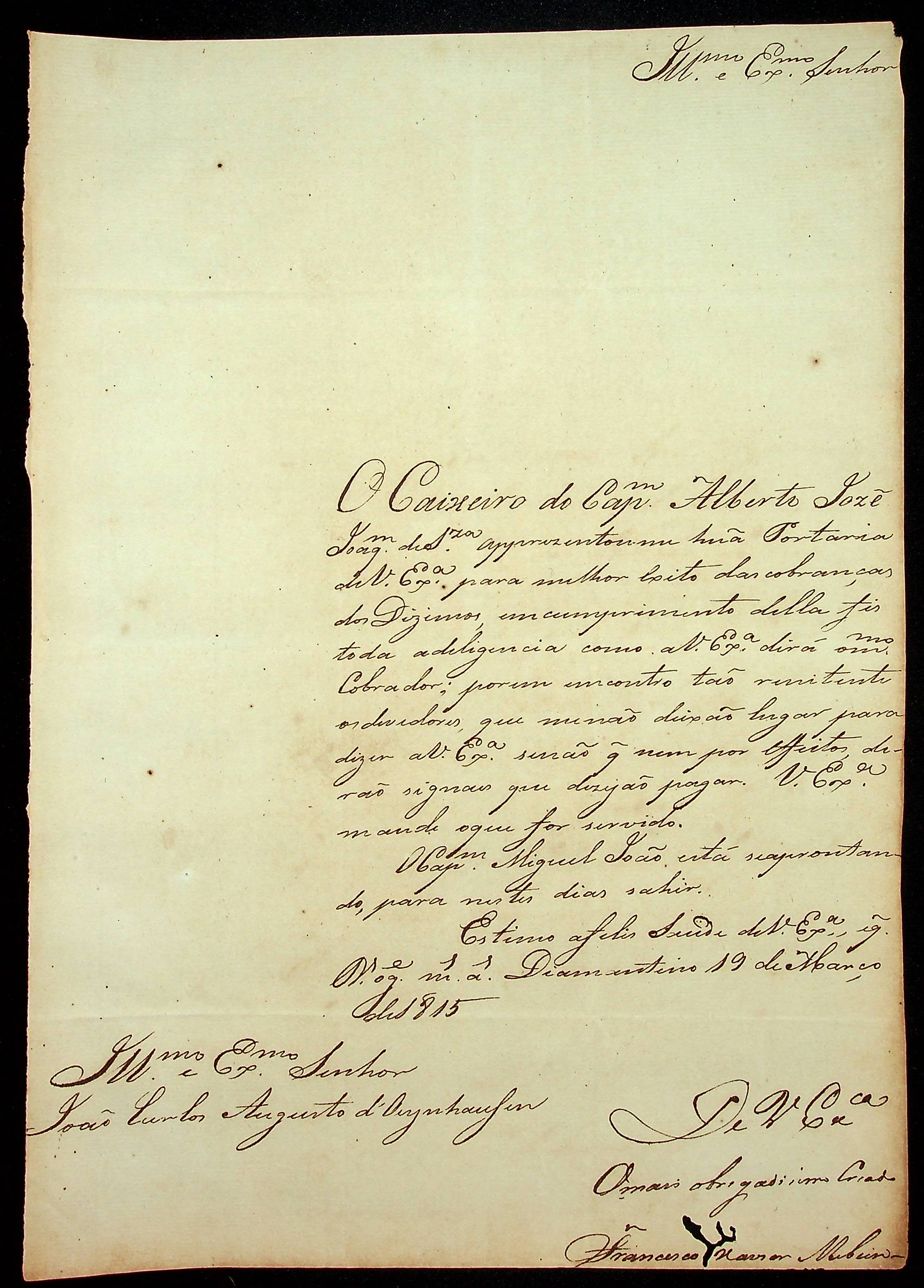 CARTA de Francisco Xavier Ribeiro ao [Governador e Capitão-General da Capitania de Mato Grosso] João Carlos Augusto d’Oeynhausen e Gravenberg.