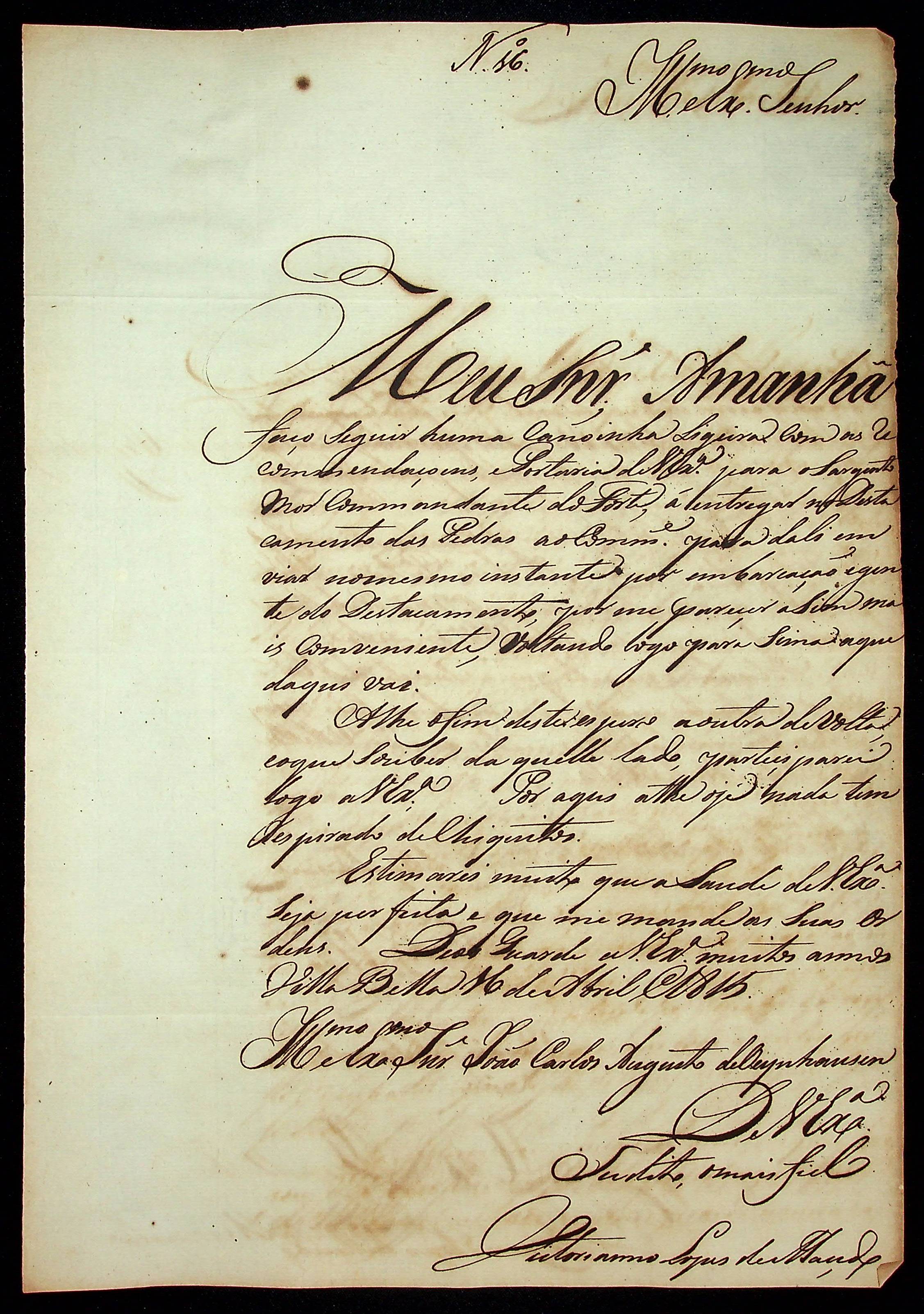 CARTA do [Tenente-Coronel] Vitoriano Lopes de Macedo ao [Governador e Capitão-General da Capitania de Mato Grosso] João Carlos Augusto d’Oeynhausen e Gravenberg.
