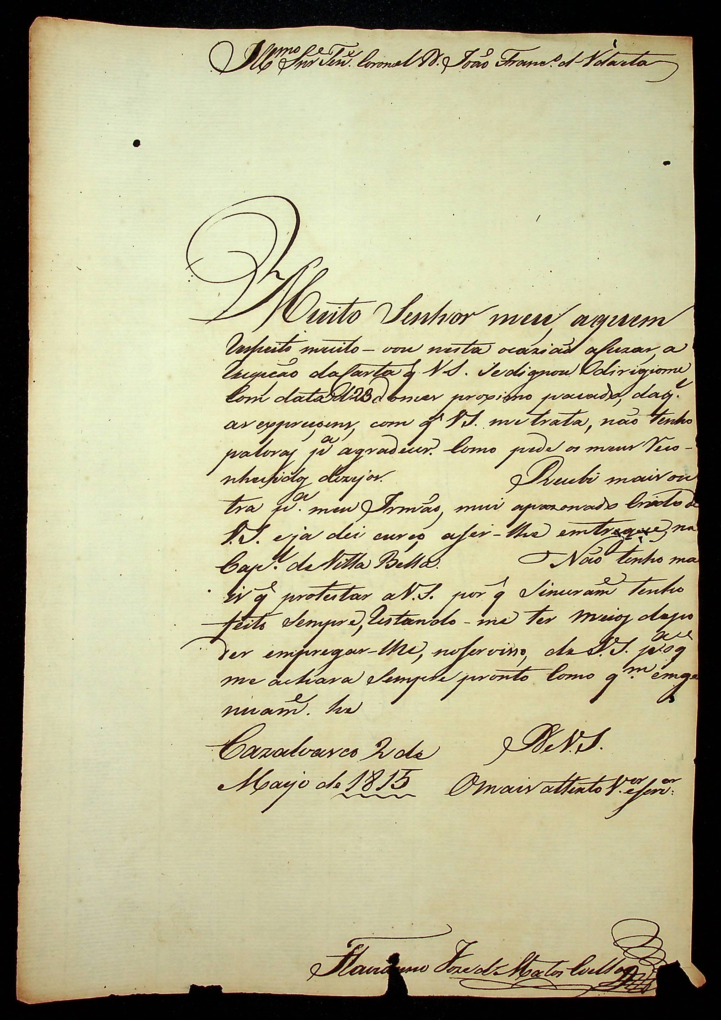 CARTA do [Capitão Comandante] Flaviano José de Matos Coelho ao Tenente-Coronel João Francisco D [Vdaeta?].