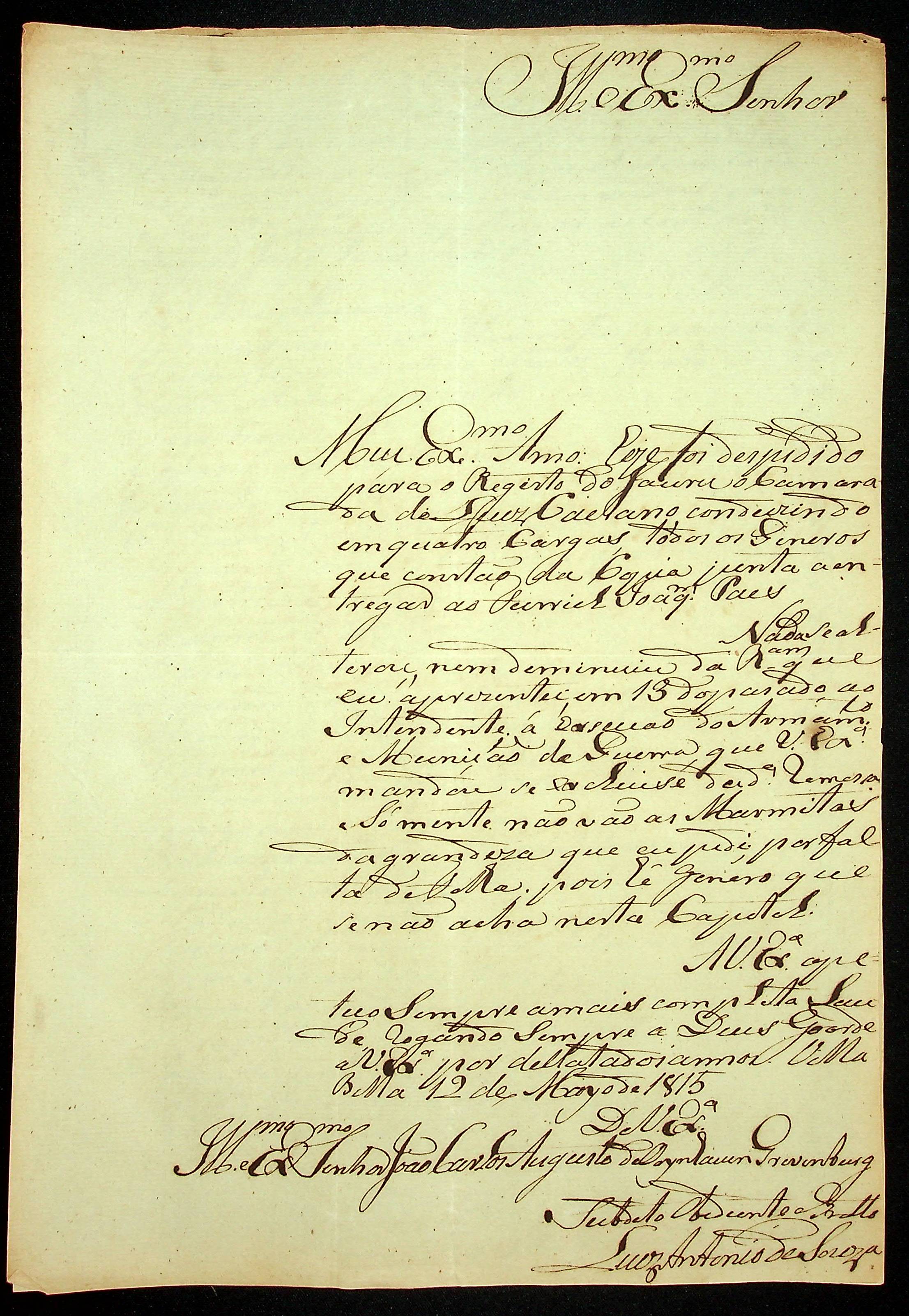 CARTA de Luiz Antônio de Souza ao [Governador e Capitão-General da Capitania de Mato Grosso] João Carlos Augusto d’Oeynhausen e Gravenberg.