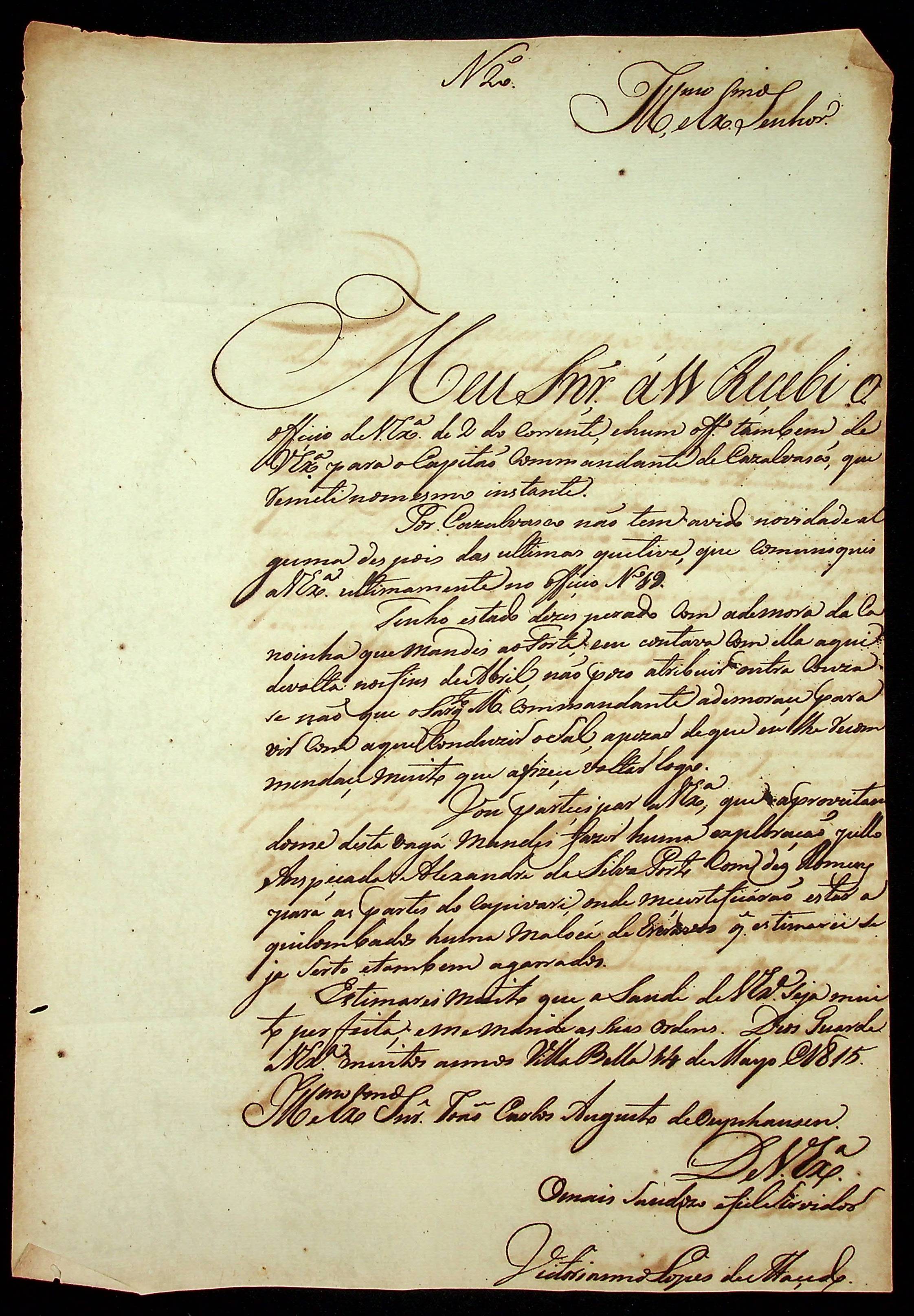 CARTA do [Tenente-Coronel] Vitoriano Lopes de Macedo ao [Governador e Capitão-General da Capitania de Mato Grosso] João Carlos Augusto d’Oeynhausen e Gravenberg.