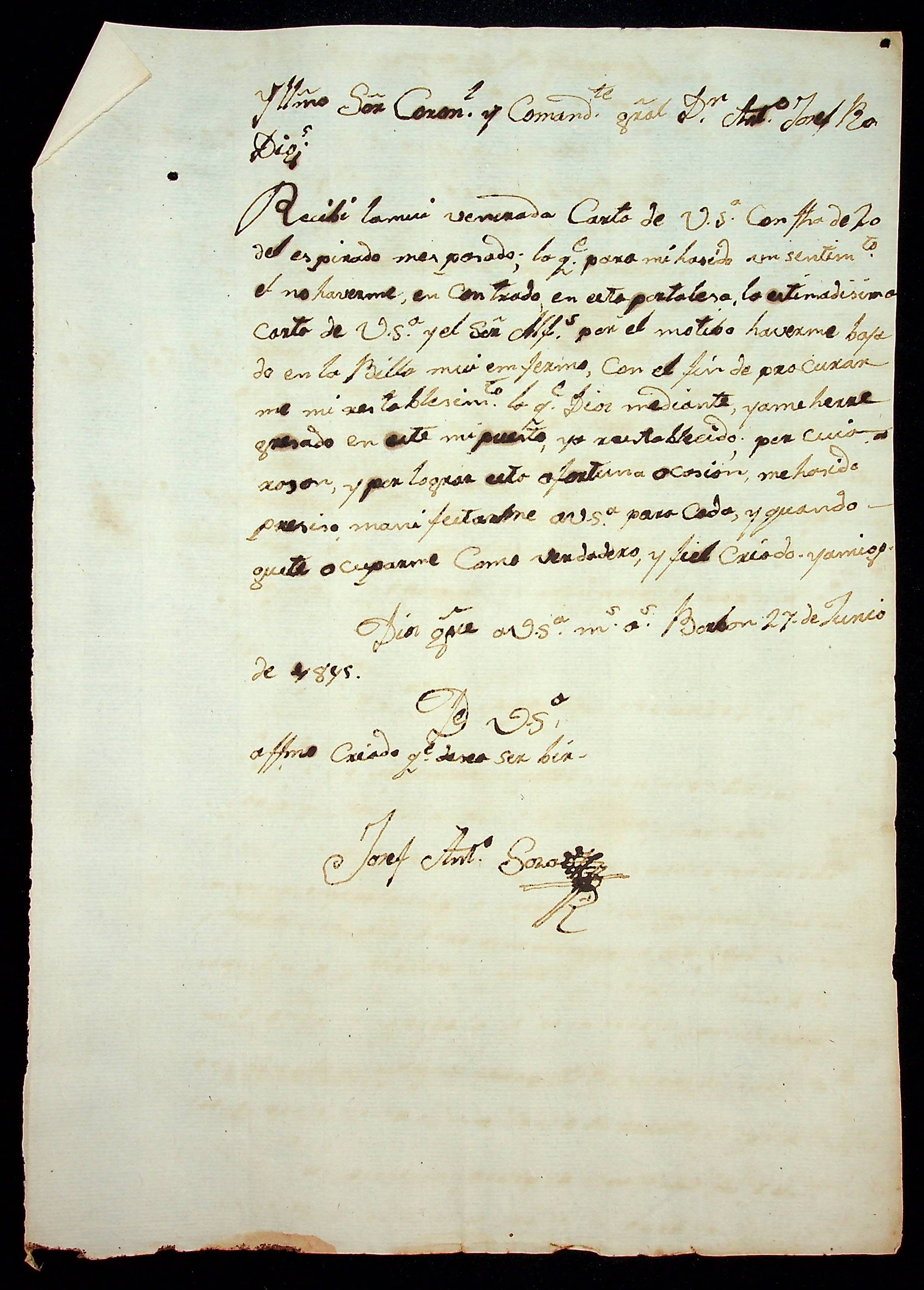 CARTA do [Capitão Comandante do Forte de Bourbon] José Antônio [Souza] ao Comandante-Geral Antônio José Rodrigues.