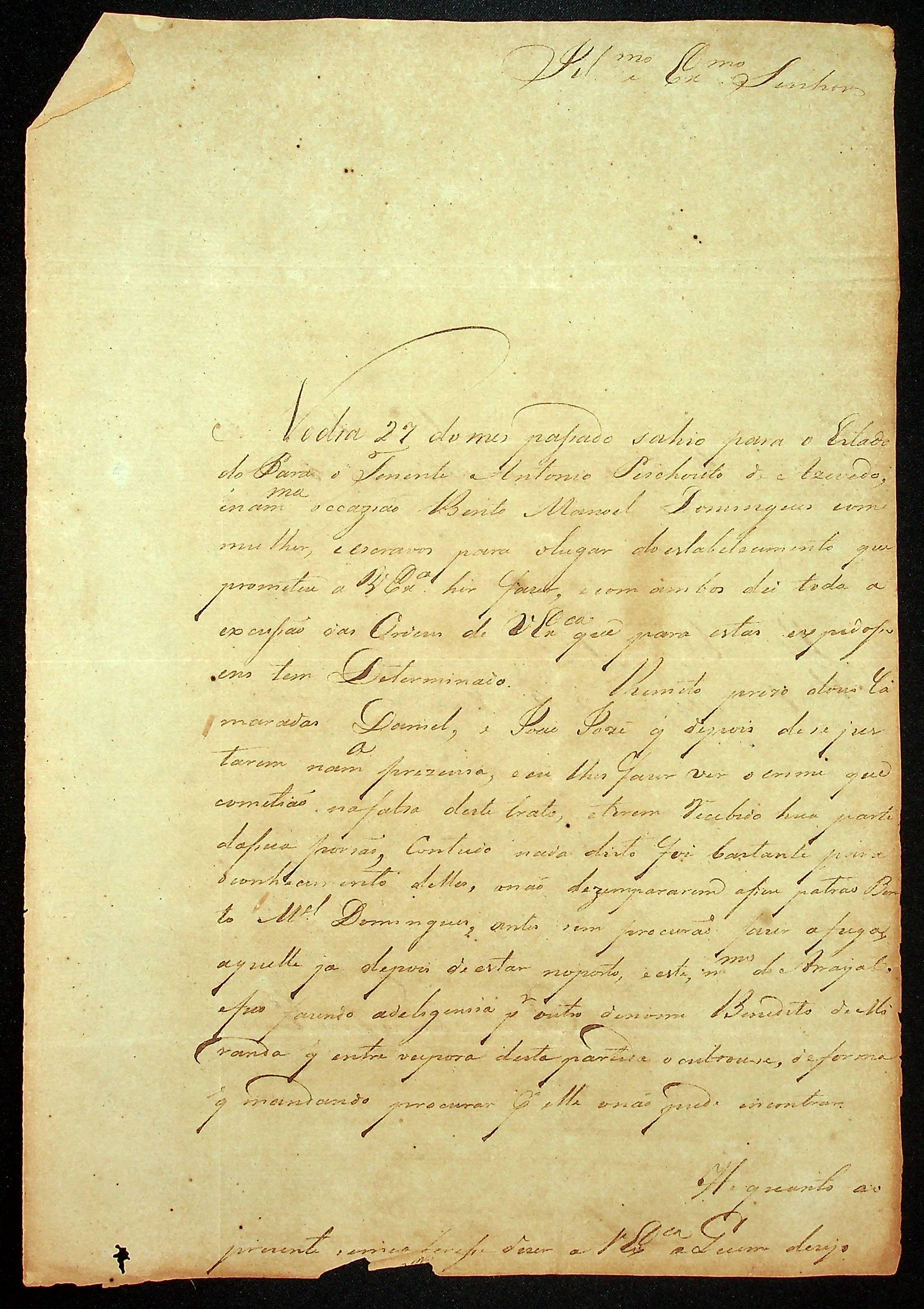 CARTA de Francisco Xavier Ribeiro ao [Governador e Capitão-General da Capitania de Mato Grosso] João Carlos Augusto d’Oeynhausen e Gravenberg.