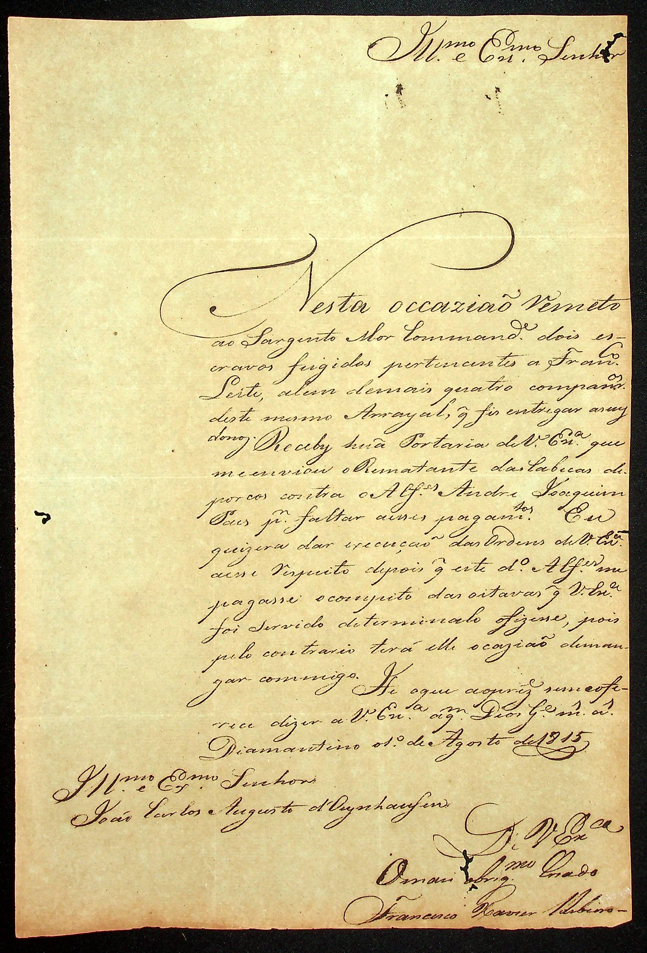 CARTA de Francisco Xavier Ribeiro ao [Governador e Capitão-General da Capitania de Mato Grosso] João Carlos Augusto d’Oeynhausen e Gravenberg.