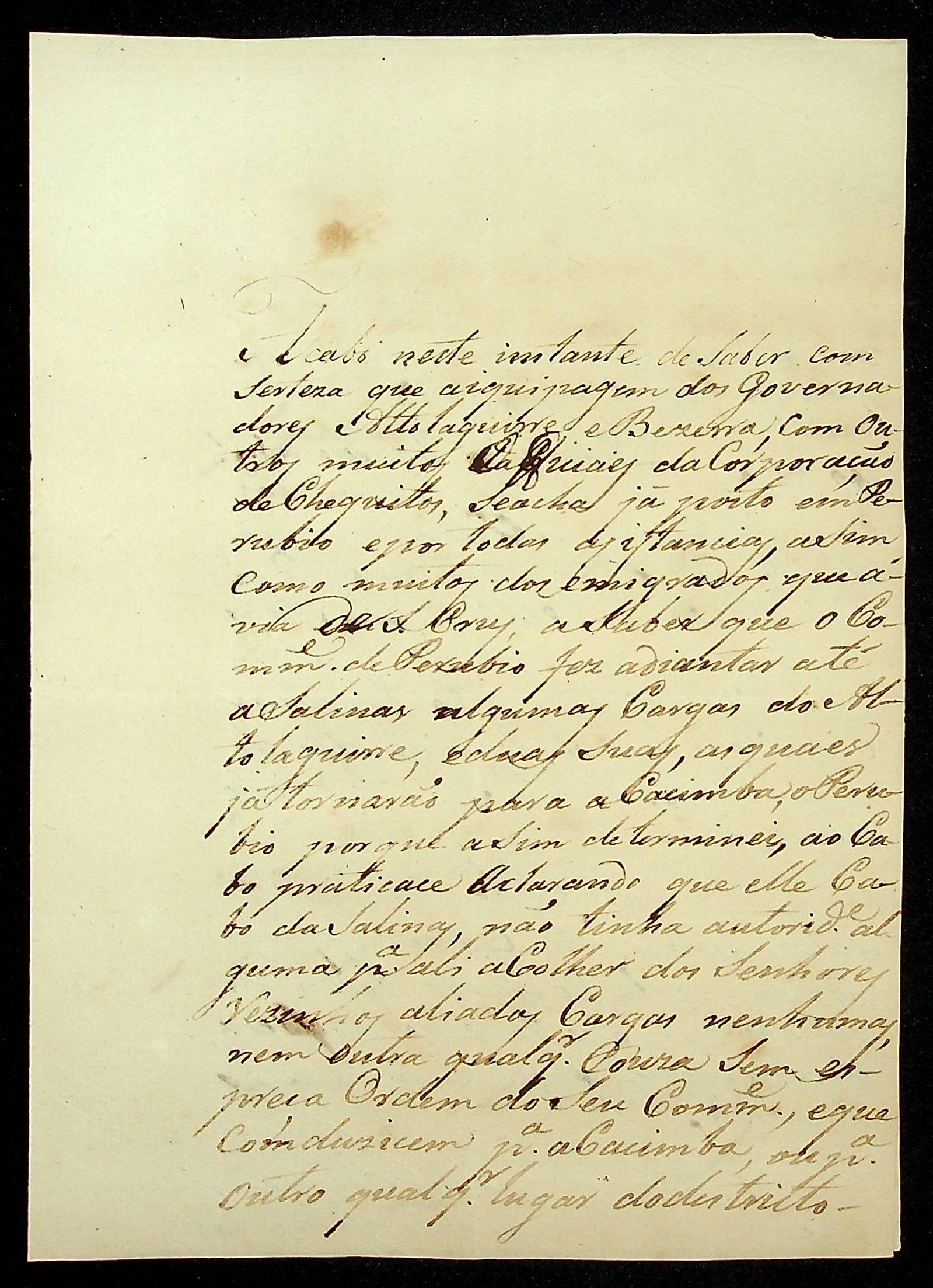 CARTA do Comandante de Casalvasco Flaviano José de Matos Coelho ao Coronel e Comandante Geral de Vila Bela Victoriano Lopes de Macedo.