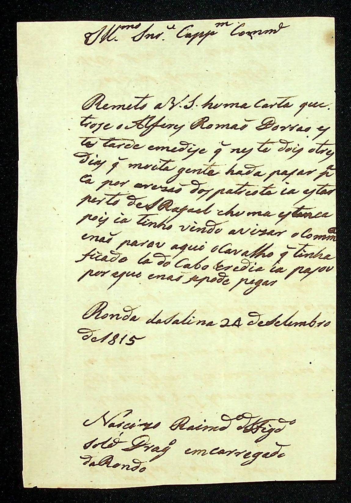 CARTA do Comandante de Casalvasco Flaviano José de Matos Coelho ao Coronel e Comandante Geral de Vila Bela Victoriano Lopes de Macedo.