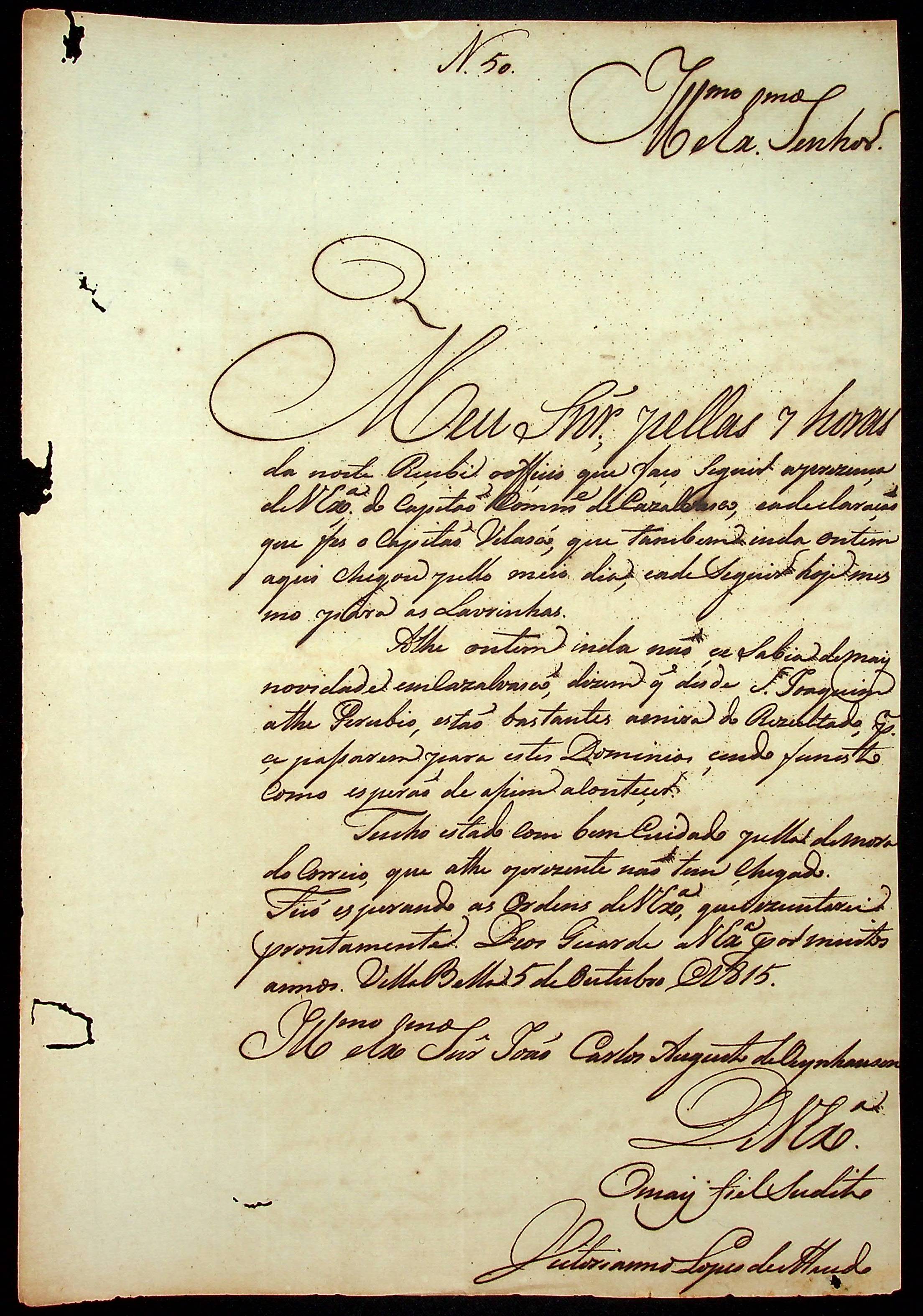 CARTA do [Coronel Comandante] Victoriano Lopes de Macedo ao [Governador e Capitão-General da Capitania de Mato Grosso] João Carlos Augusto d’Oeynhausen e Gravenberg.
