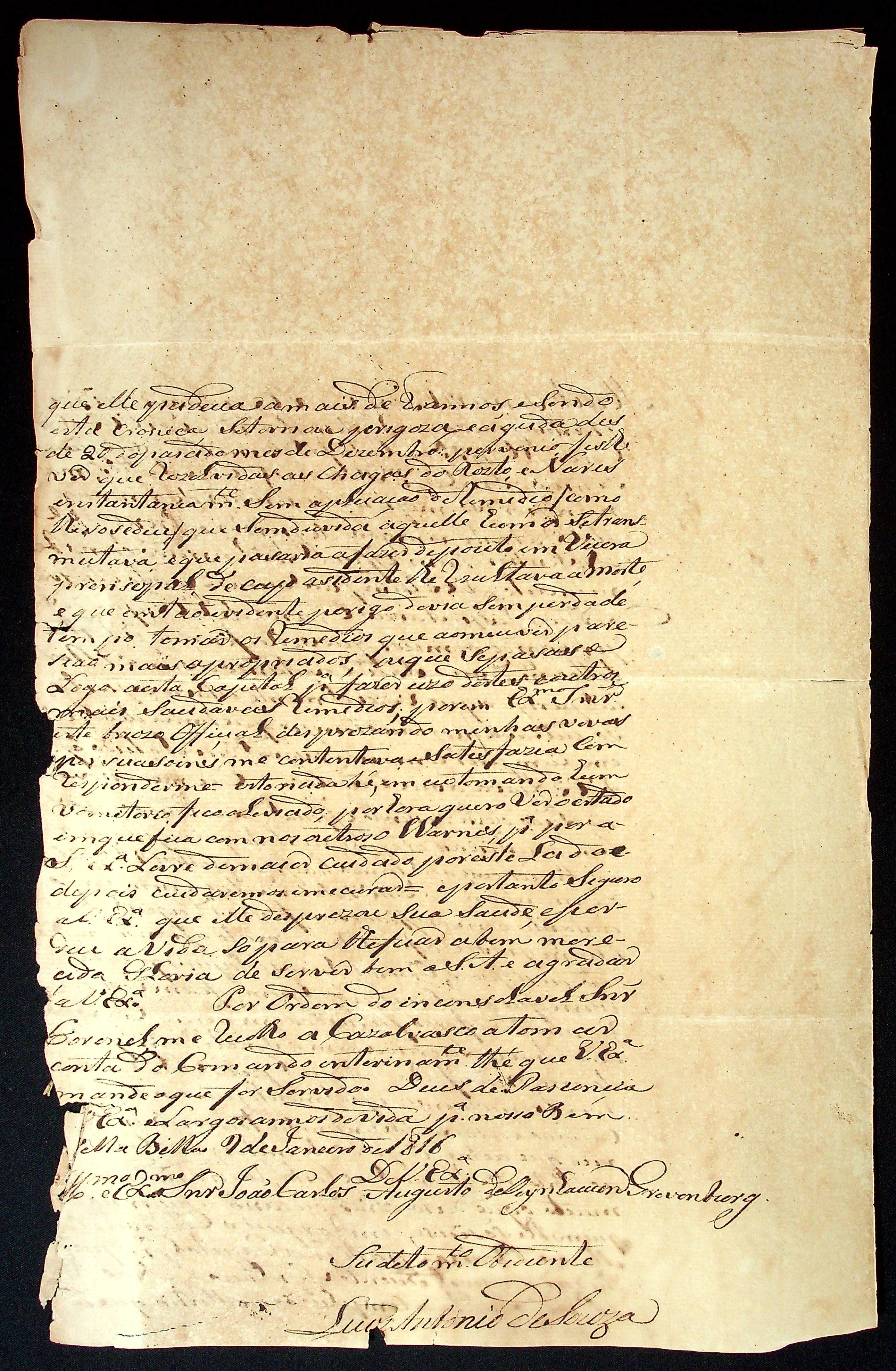 CARTA de Luiz Antônio de Souza ao [Governador e Capitão-General da Capitania de Mato Grosso] João Carlos Augusto d’Oeynhausen e Gravenberg.