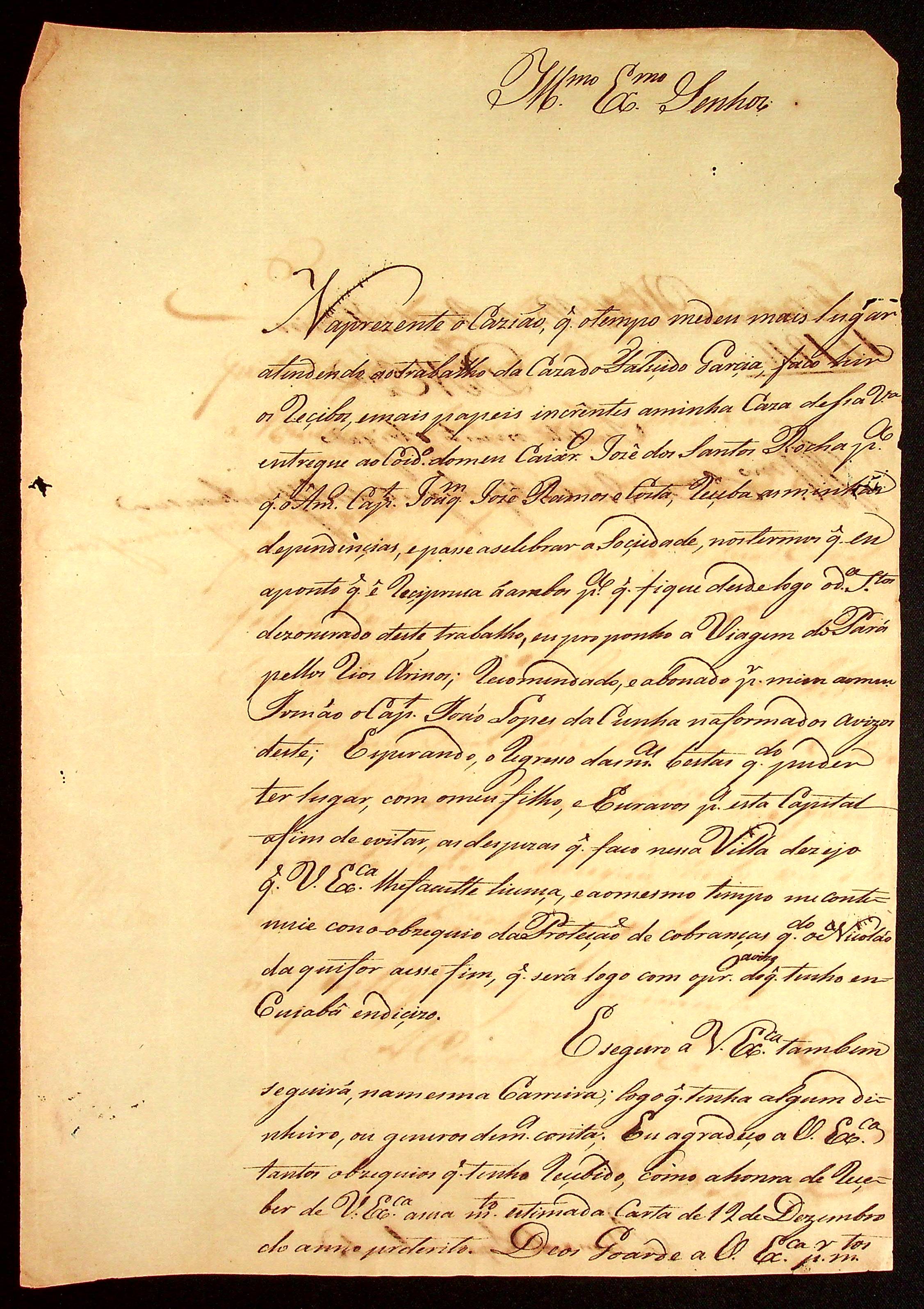 CARTA do [Capitão] Bernardo Lopes da Cunha ao [Governador e Capitão-General da Capitania de Mato Grosso] João Carlos Augusto d’Oeynhausen e Gravenberg.