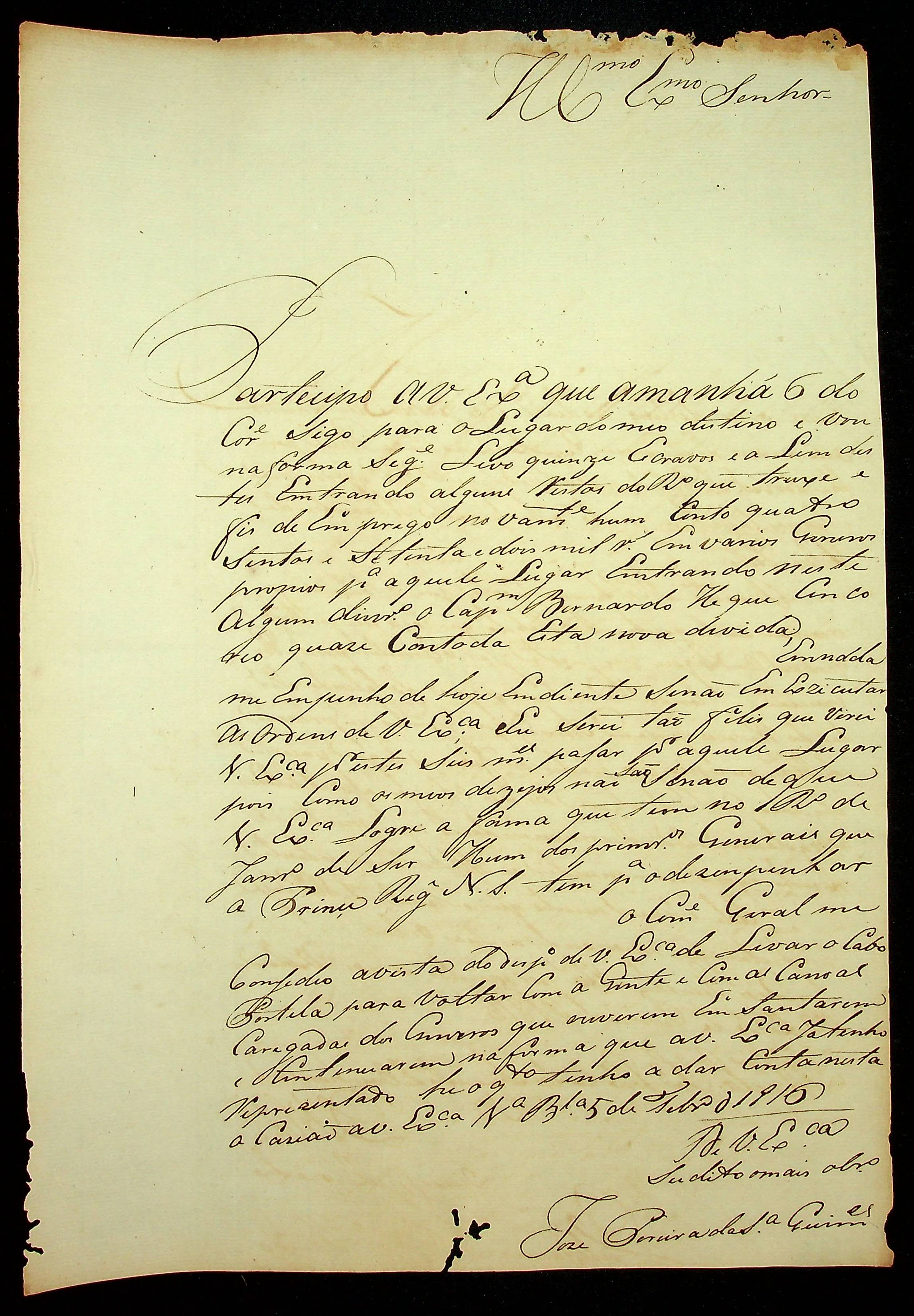 CARTA de José Pereira da Silva Guimarães ao [Governador e Capitão-General da Capitania de Mato Grosso] João Carlos Augusto d’Oeynhausen e Gravenberg.