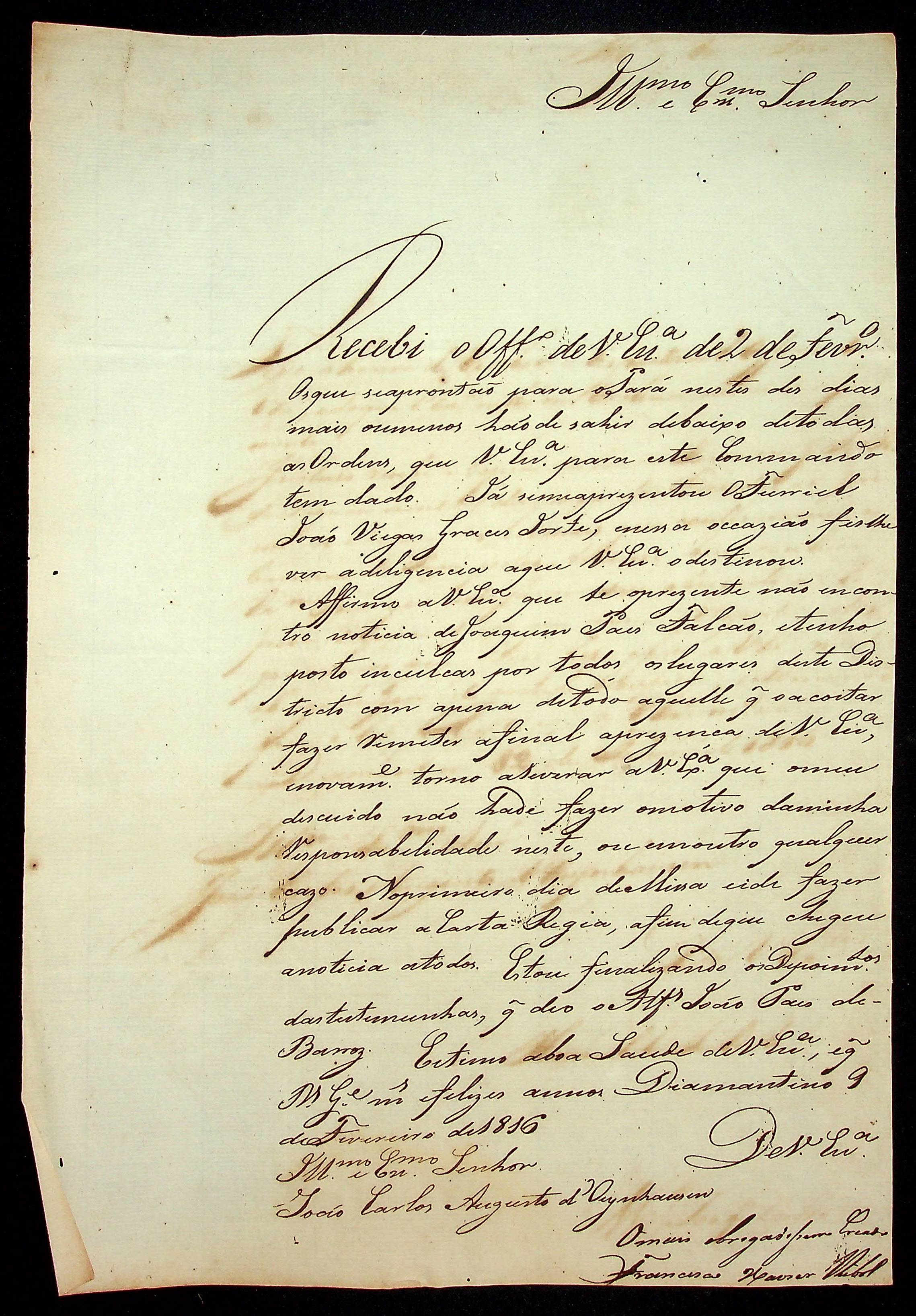 CARTA do [Ajudante e Comandante] Francisco Xavier Ribeiro ao [Governador e Capitão-General da Capitania de Mato Grosso] João Carlos Augusto d’Oeynhausen e Gravenberg.
