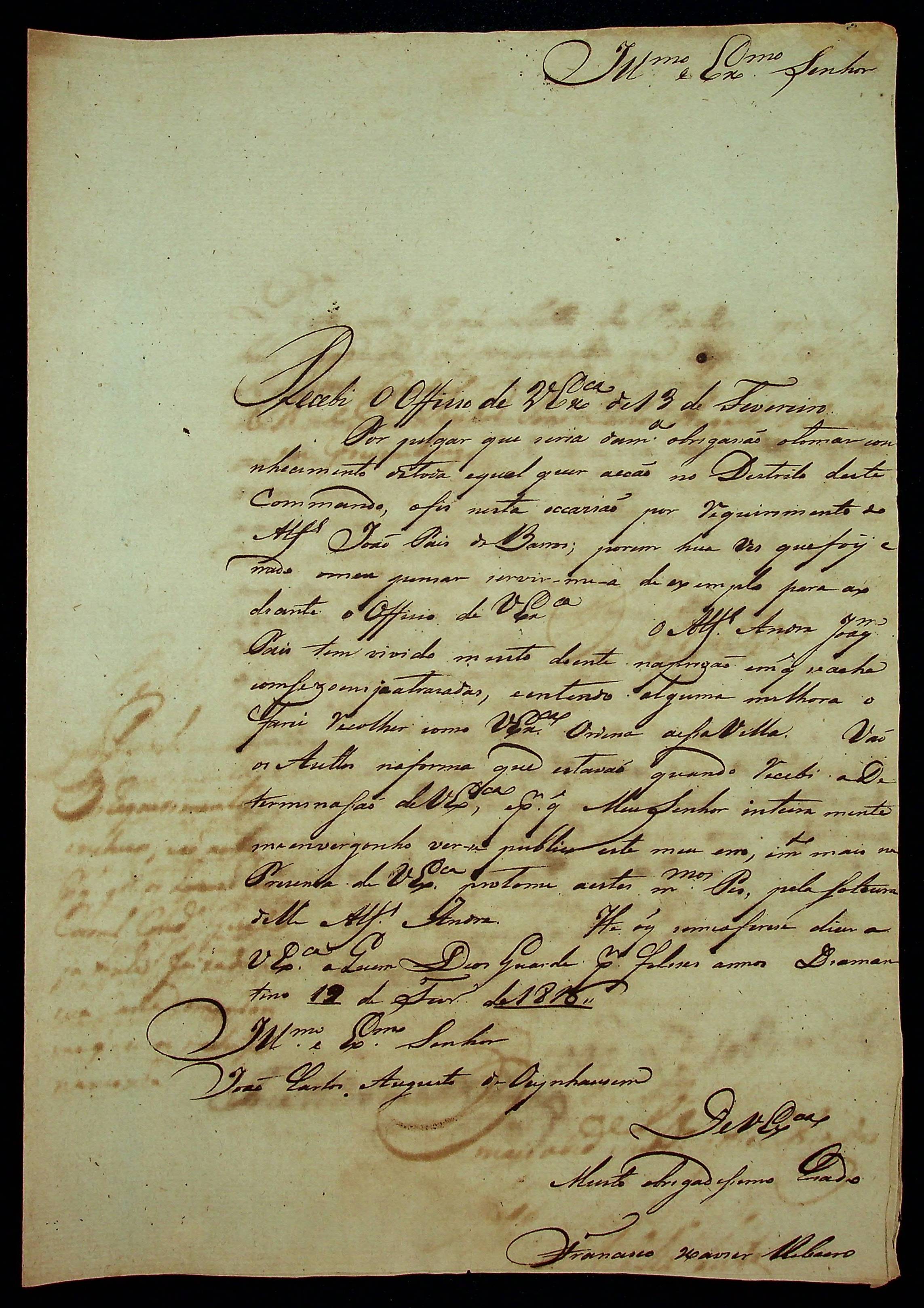 CARTA do [Ajudante e Comandante] Francisco Xavier Ribeiro ao [Governador e Capitão-General da Capitania de Mato Grosso] João Carlos Augusto d’Oeynhausen e Gravenberg.