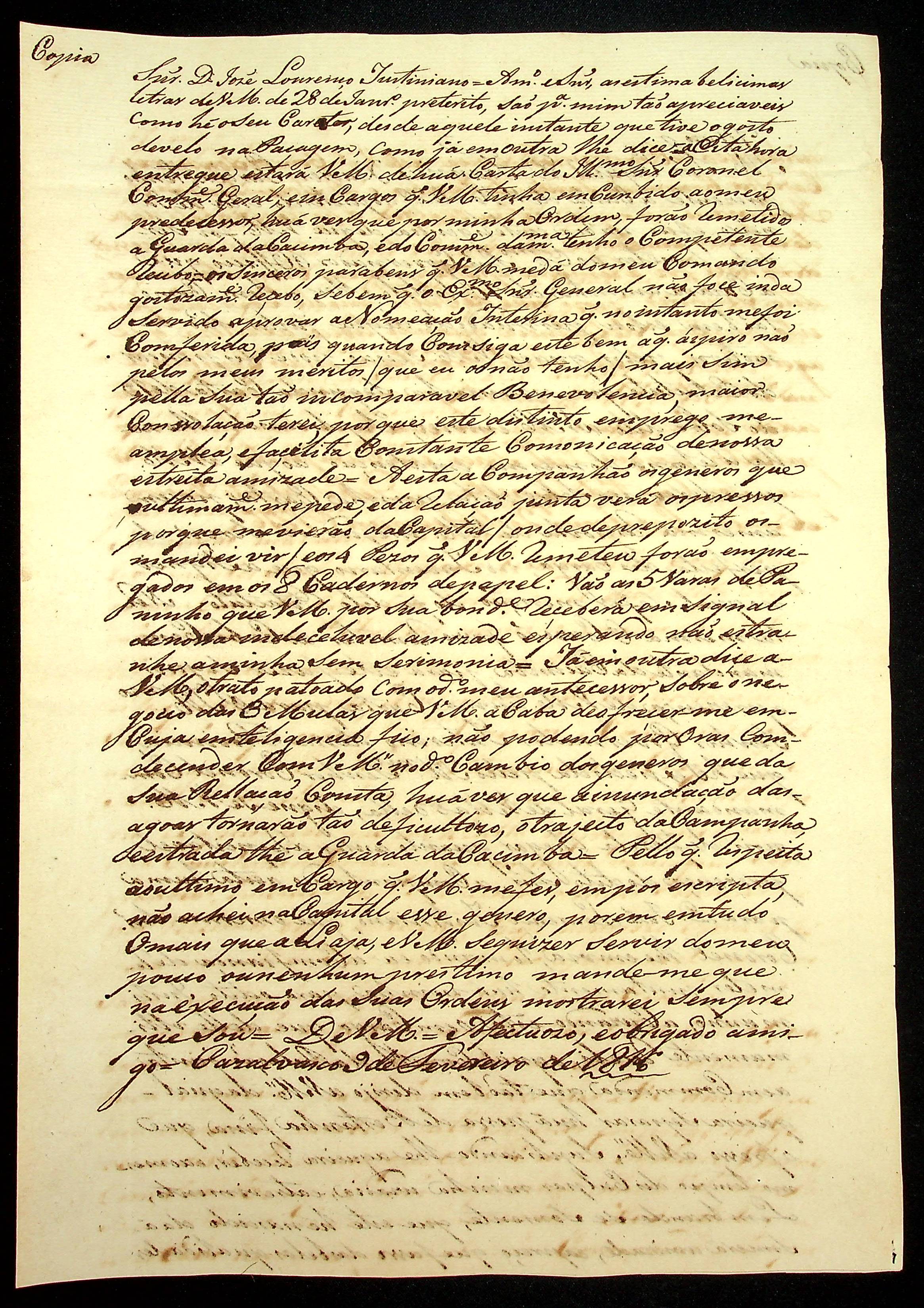 CARTA do [Alferes Comandante] Luiz Antônio de Souza ao [Governador e Capitão-General da Capitania de Mato Grosso] João Carlos Augusto d’Oeynhausen e Gravenberg.