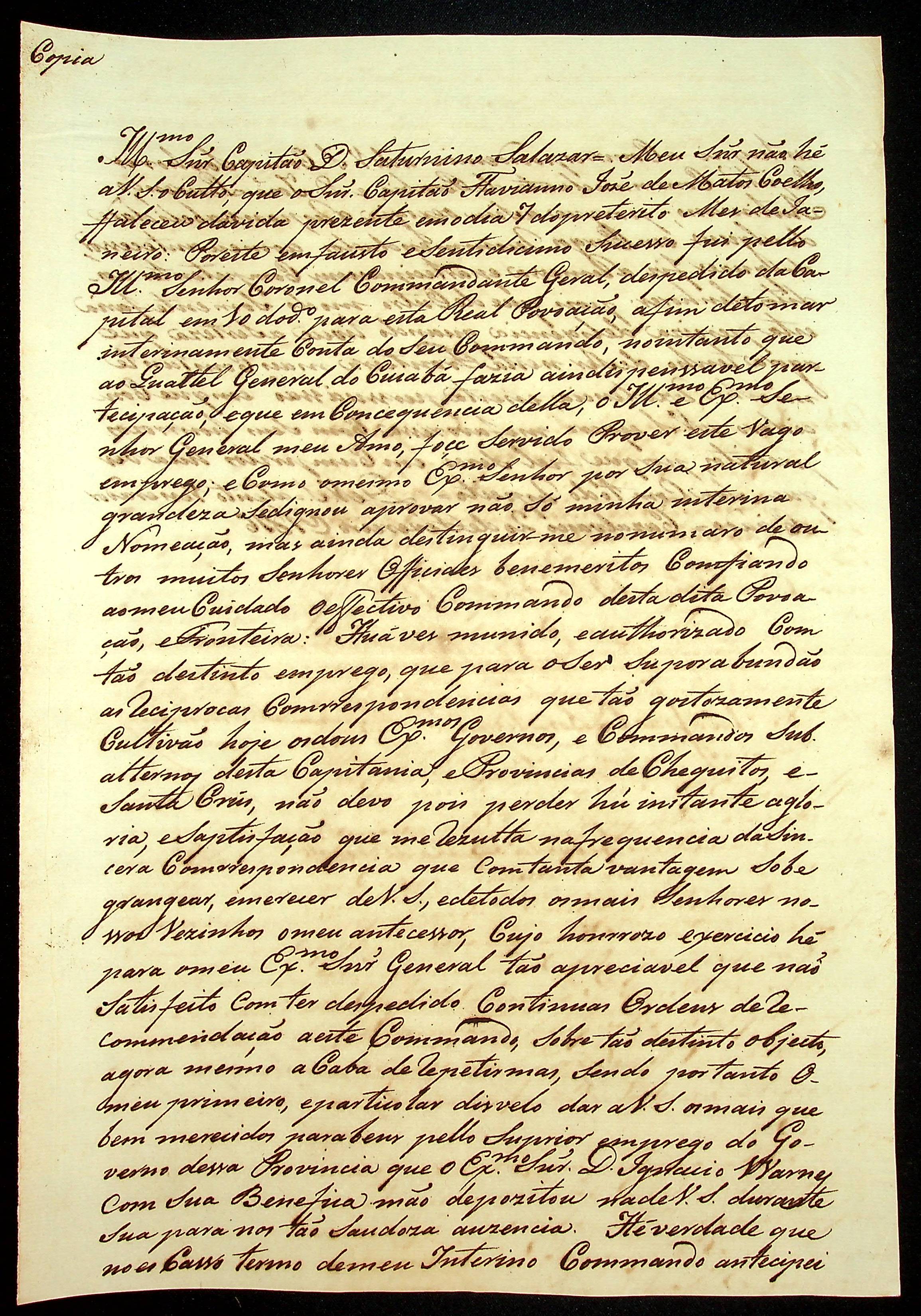 CARTA do [Alferes Comandante] Luiz Antônio de Souza ao [Governador e Capitão-General da Capitania de Mato Grosso] João Carlos Augusto d’Oeynhausen e Gravenberg.