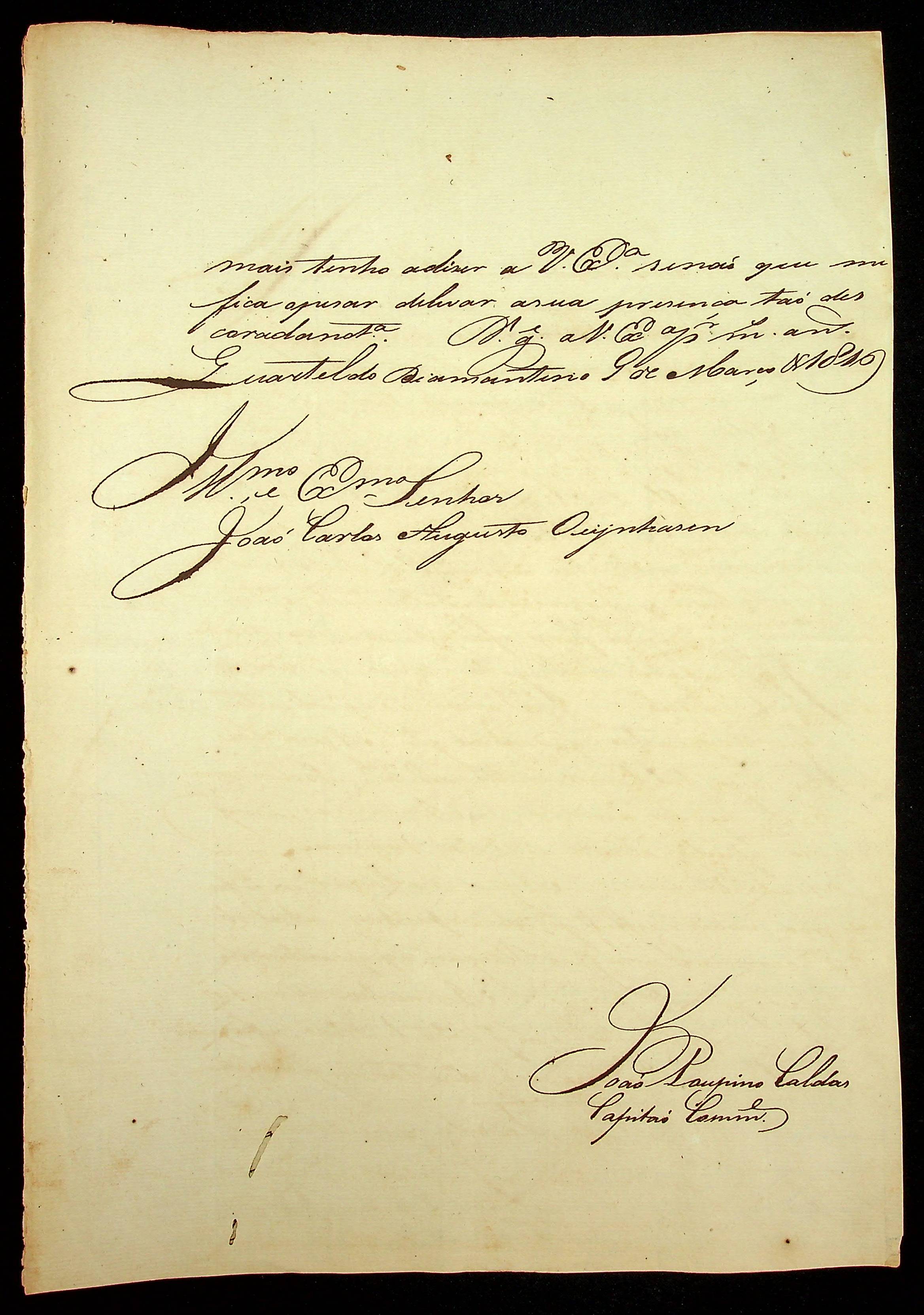 CARTA do Capitão Comandante João Poupino Caldas ao [Governador e Capitão-General da Capitania de Mato Grosso] João Carlos Augusto d’Oeynhausen e Gravenberg.